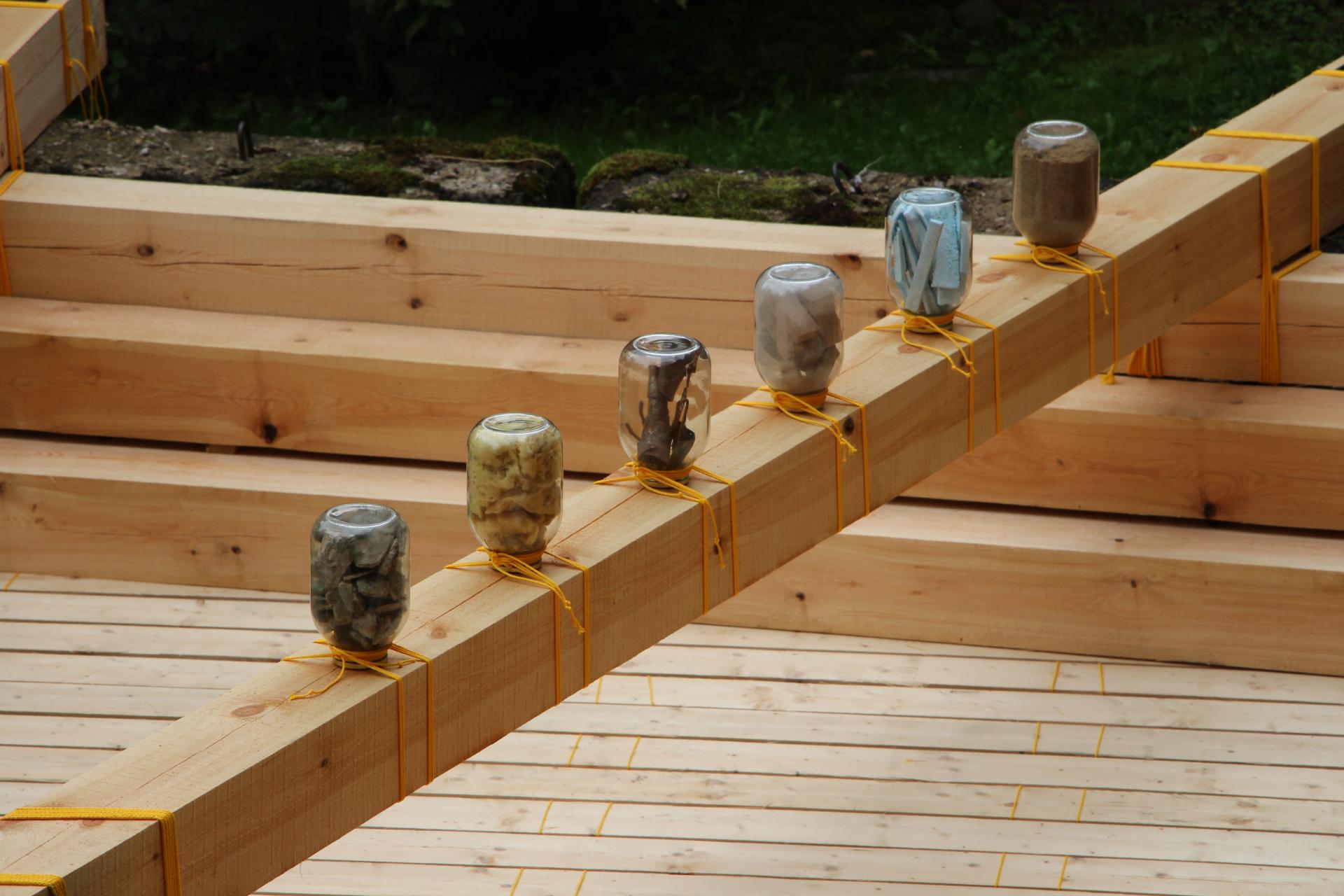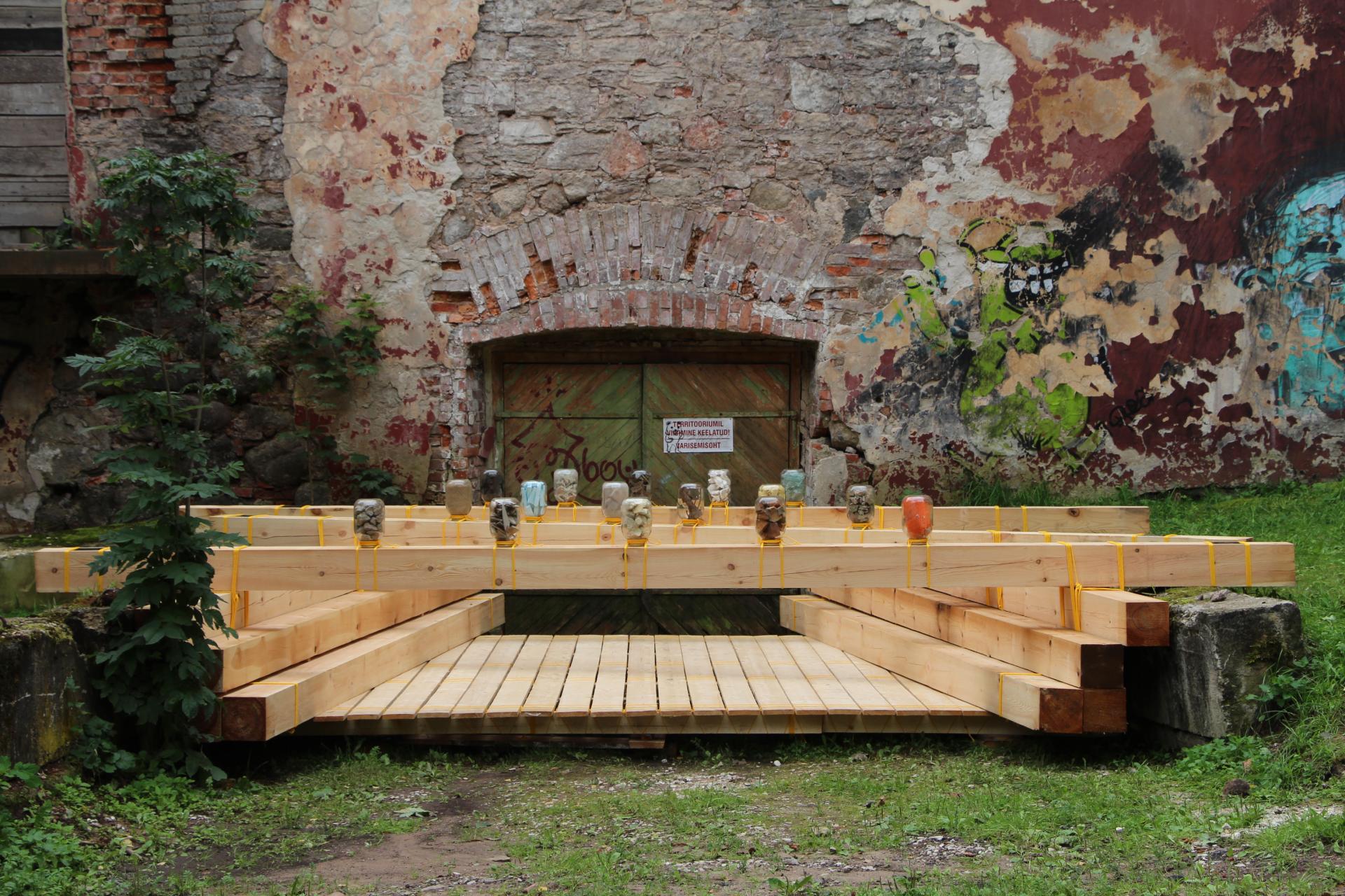 In an art exhibition inspired manner, a wooden platform and steps were embedded between old concrete walls in front of the ruin and wooden beams functioned as exhibition stands for the artefacts. Only on a closer look, visitors could see that the colourful exhibition consists of milk jars filled with construction waste which was found across Tartu. Confused, many visitors started to search for the reason for this exhibition of trash. On the end of each beam a labelled mirror with quotes and statistics delivered the message “Waste is a design flaw!”. Our cities and even our homes are large man made material deposits. But we fail dramatically in reusing or at least recycling these materials, resulting in a more and more increasing exploitation of natural resources and a self-inflicted waste catastrophe. The aim of the installation was to sensibilize the visitors on the waste problem and encourage one to act upon it.
