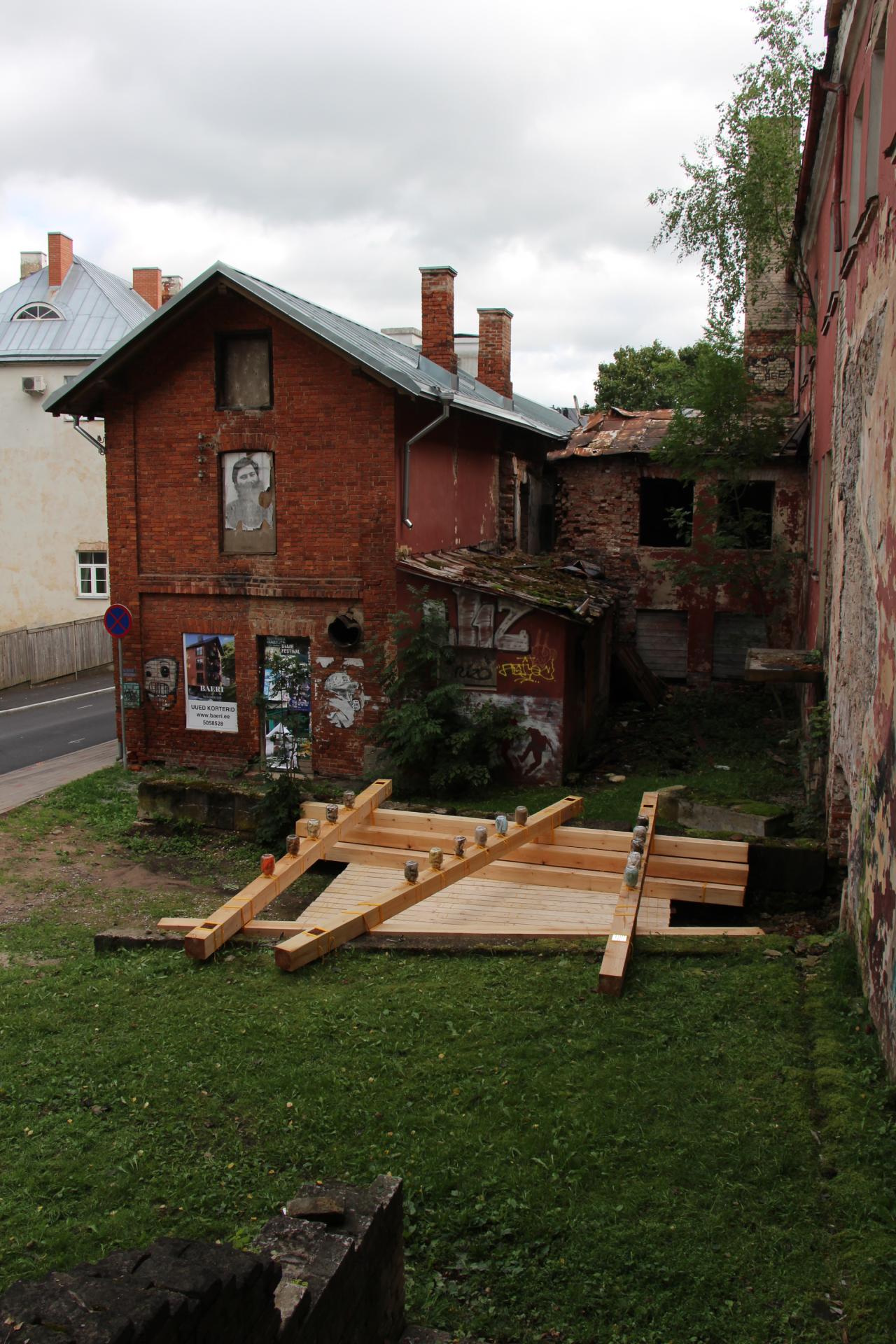 “Linna-Aarete Raamatukogu”, Estonian for “Library of Urban Treasures” was our installation for the UIT-Urban Festival in Tartu. Our “parasitic” intervention was located at the forecourt of an abandoned and rundown industrial building, right in front of the ruins of Tartu Cathedral. A very bussy small street, used by cars, bicycles and pedestrians alike, runs by the place, leading towards the University and inner city.