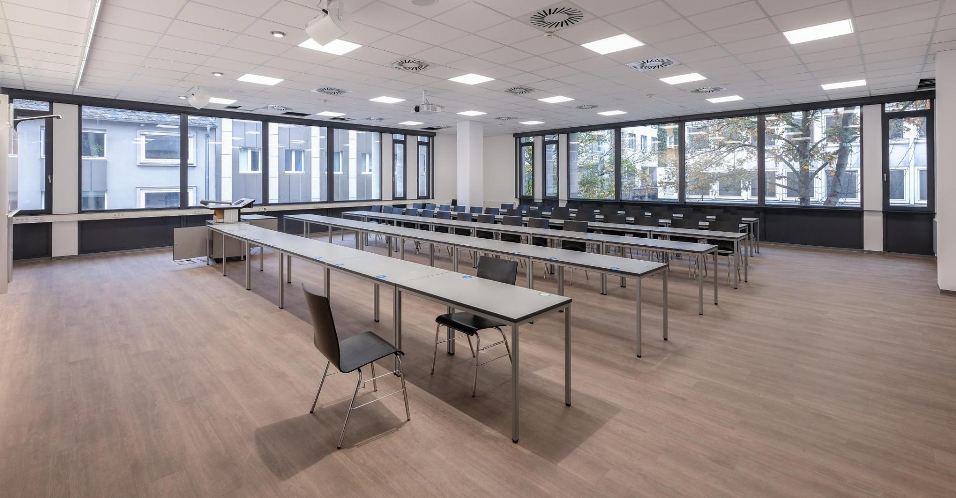 The project Hörsaalzentrum am Unteren Schloss (lecture center) is part of the project Siegen. Knowledge unites and focuses on two fundamental problems of sustainability: the re-use of real estate and the reshaping of quarters in transformation.The goal is the re-design of a former department store while integrating the existing building fabric. The modernization does not only improve the energy balance of the building, but rather the resource balance as there is less use of building material and area. Restructuring this very building from 1971 means restructuring one from the grey inventory that never had to meet any goals of heat insulation or energy efficiency. A new life cycle started for the building that was initially not anticipated.By adding a floor on the top and renewing the façade of what’s now the lecture center, it was possible to raise the energy standards to modern levels of building insulation. The building now meets high efficiency standards: the ventilation system uses CO2 sensors to identify the demand which saves energy, while LED technique saves up to 75% compared to conventional lighting. Since the building has just been completed in autumn of 2020, in the middle of a pandemic, it has seen little use and it is hard to testify about its energy savings.The second goal manifests in urban planning. City centers lose their attraction: department stores break away in anchoring customers for retail and the pandemic exacerbates this situation. Moving three faculties to the city center, the university creates attractive, vivid and sustainable quarters that function as anchor for retail and open public spaces for recreation and discourse. The lecture center is nucleus and hinge-joint for a city center university: it links campus of three faculties and opens up the university to a wider public. Compact, multi-role quarters are created that sustainably reduce traffic, in addition to short-distance routes and new mobility concepts for the city center.