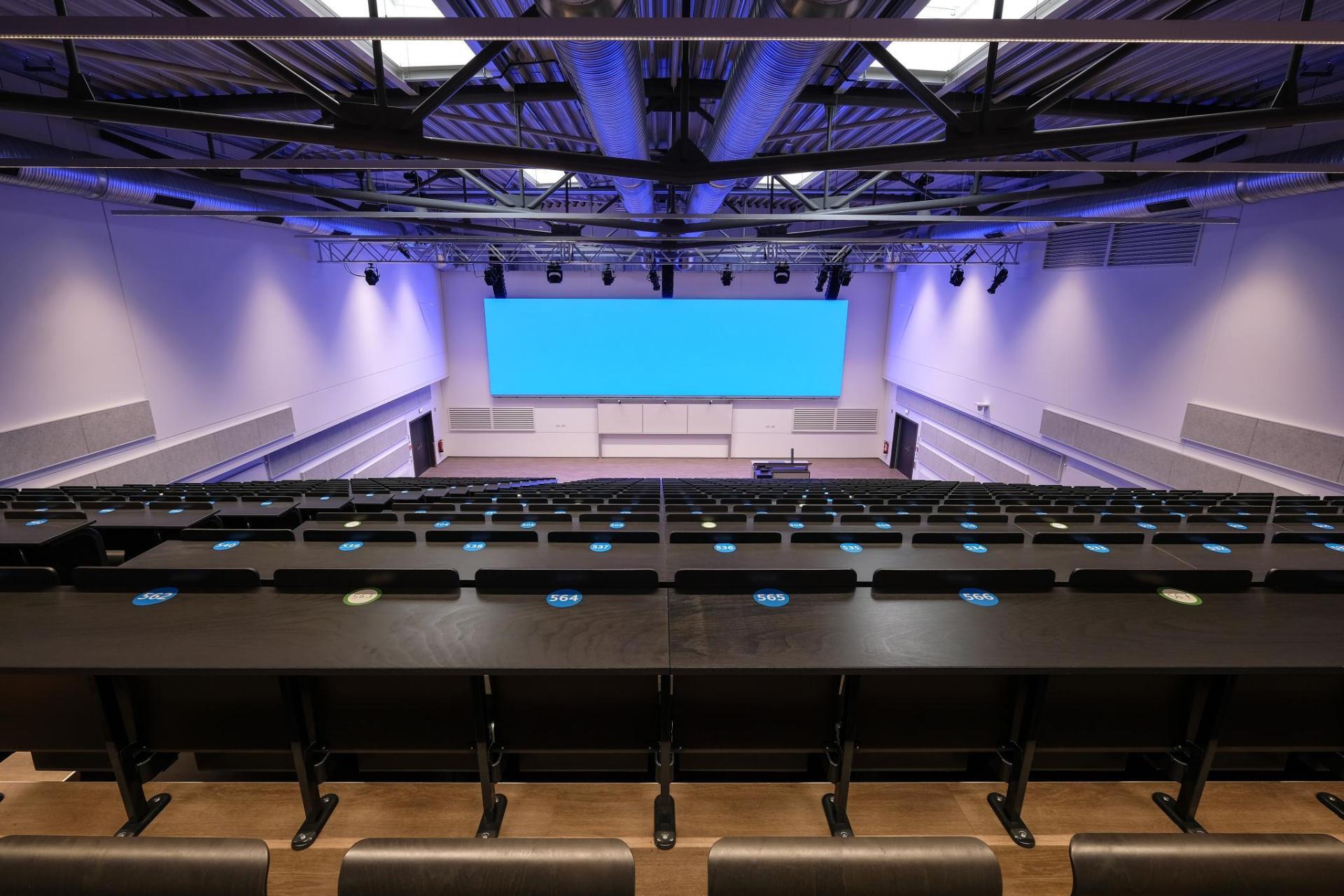 From an engineering perspective, large efforts have been made to revitalize existing building fabric and to connect this to new concepts. While the department store was still open, the escalators had to be dismantled and the main girders of pi panels were sawn and lifted on the spot while hanging from a crane. The roof was removed and the building was increased with an upward-sloped floor in order to meet the height requirements of the lecture theater with rising stalls and the essential technical centers of building. Since parts of the building reach two stories below the castle square, it was