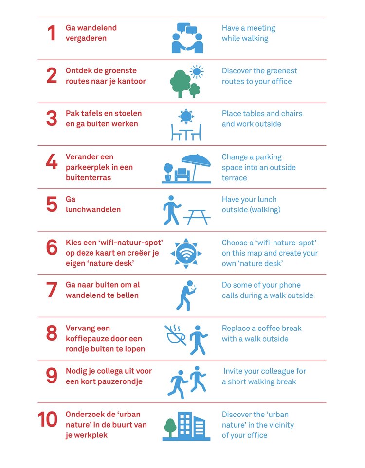 Do you also prefer to take your work outdoors? Are you meeting your colleagues in a city park close to home? Do you have phone conversations whilst walking outside? Do you find yourself grabbing a table and chairs from your home or office, placing them on a balcony, on the pavement or garden in order to read or write? Work, well-being and urban nature are indivisibly linked.