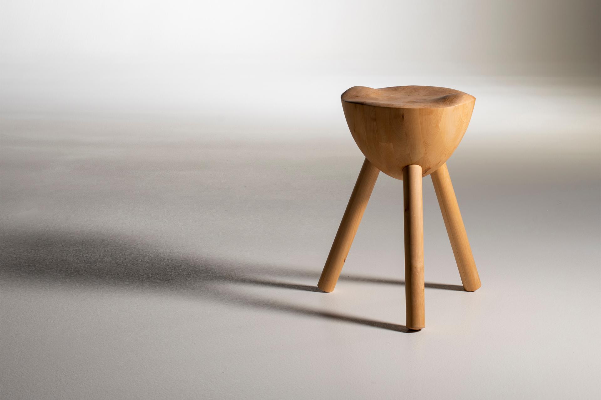 The solid wood is dried and used to design a stool inspired by the traditional Finnish form language. The leftover material, branches, bark and wood pieces, is processed into fibers, researched for a new biomaterial, and used in a design casting process for bowl shapes. Leftover fibres are also used to make paper for the publication start pages, a shirt is died with the tree bark, leaves are made into tea, and a Finnish traditional sauna "vihta" is made of leafy branches, leftover pieces used to warm a sauna with tender heat ("löyly").