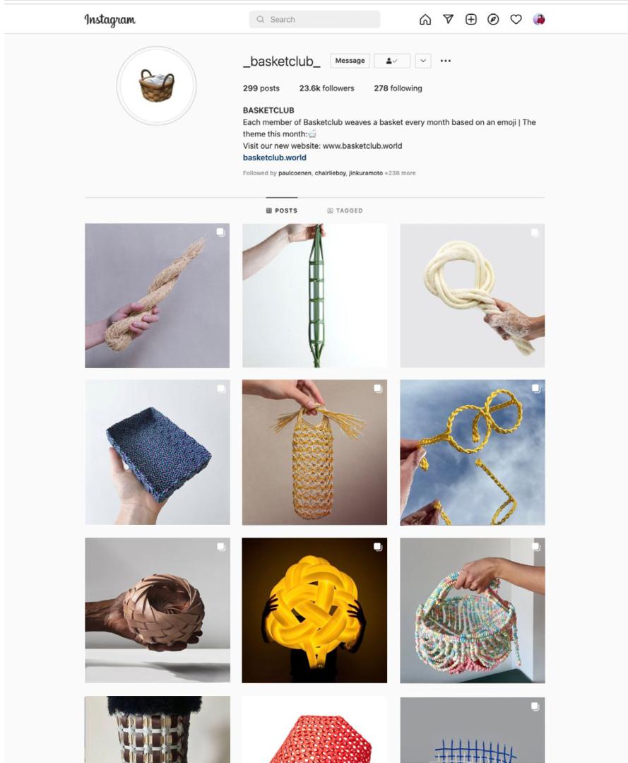 In the spring of 2020, Basketclub was founded by Jamie Wolfond and myself. The pandemic had just changed the state of the world and we had met on Instagram, connected by a mutual, crafty focus point as designers: we were both interested in finding modern applications for the traditional craft of basketry. In our autonomous projects, we had both been playing with unconventional materials and shapes. We decided to provide a fresh focus much needed by many artists and designers. By choosing an online format, we found a way to transform the sense of isolation into a productive communal spirit. An Instagram-based initiative, our platform quickly grew into an online community for crafts enthusiasts alike. The principle was simple: the account was a publishing point for curated basketry input from a selected group of artists and designers. These individuals and collectives made and photographed baskets in response to a monthly changing theme. The themes were presented as emojis, underlining the playful character of the initiative. In its approach, Basketclub crossed multiple borders. Firstly national borders, as participants throughout Europe (and even a few other countries) were able to collaborate, exchange knowledge and viewpoints. Secondly, Basketclub provided a regular “open brief”, so every once in a while, anyone could submit a basket. Thus, the option to use our platform did not remain closed off from the general public. Thirdly, we crossed the border of digital-physical exhibition spaces. We participated in several real-life exhibitions and collaborated with the brands DEDON, Karimoku and Maharam along the way. Simultaneously, we broadened the scope of our digital representation by launching our own website, which functions as a catalogue of modern basketry, 3D braiding and weaving projects.