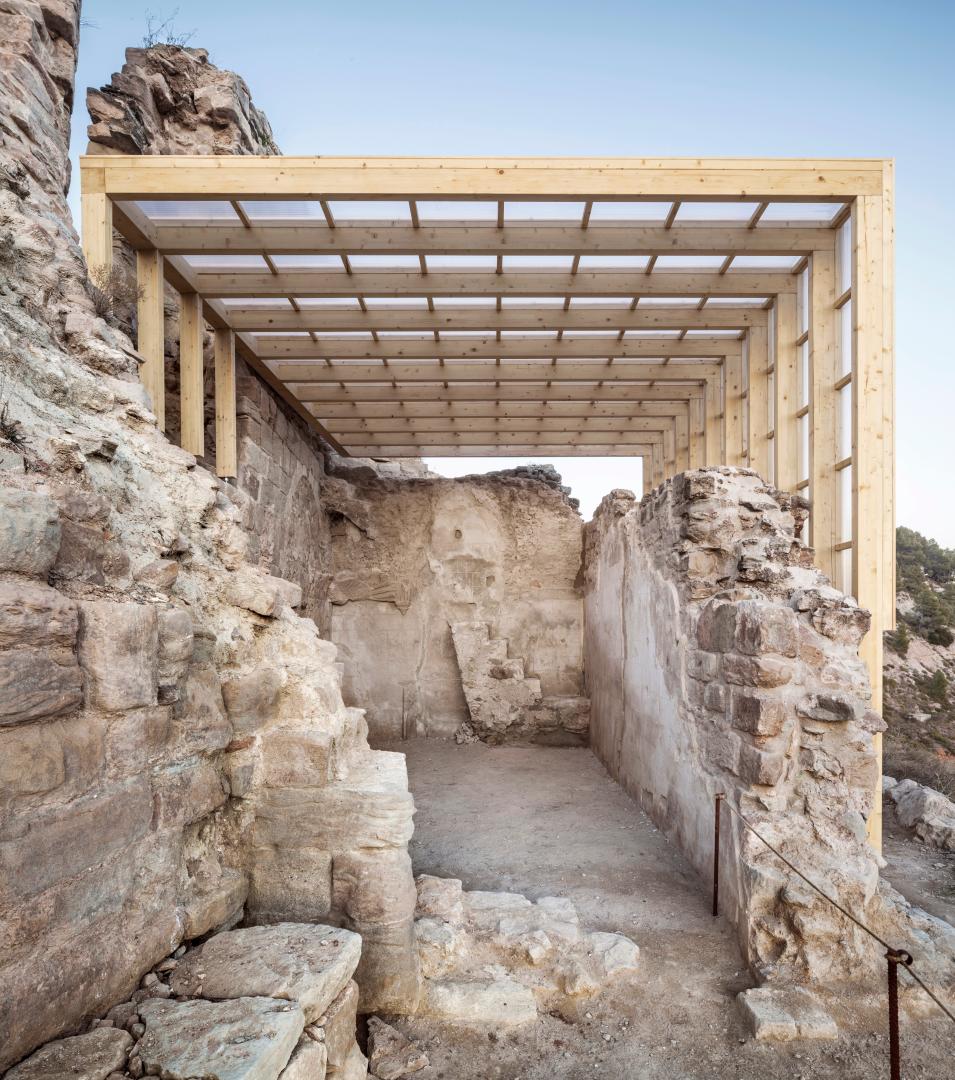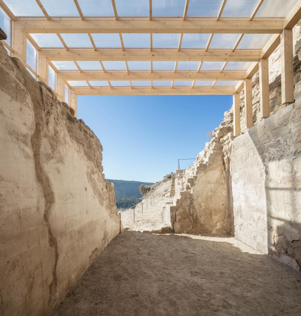 Each intervention element is originated from a functional need or decision. Once the excavation was completed all the remains -walls and pavements- were consolidated, the chapel roof preserves sgraffito, bevels and gypsum plasters, the retaining wall stabilizes the superior terrace, and the limits and topographic adaptations allow a secure visit.