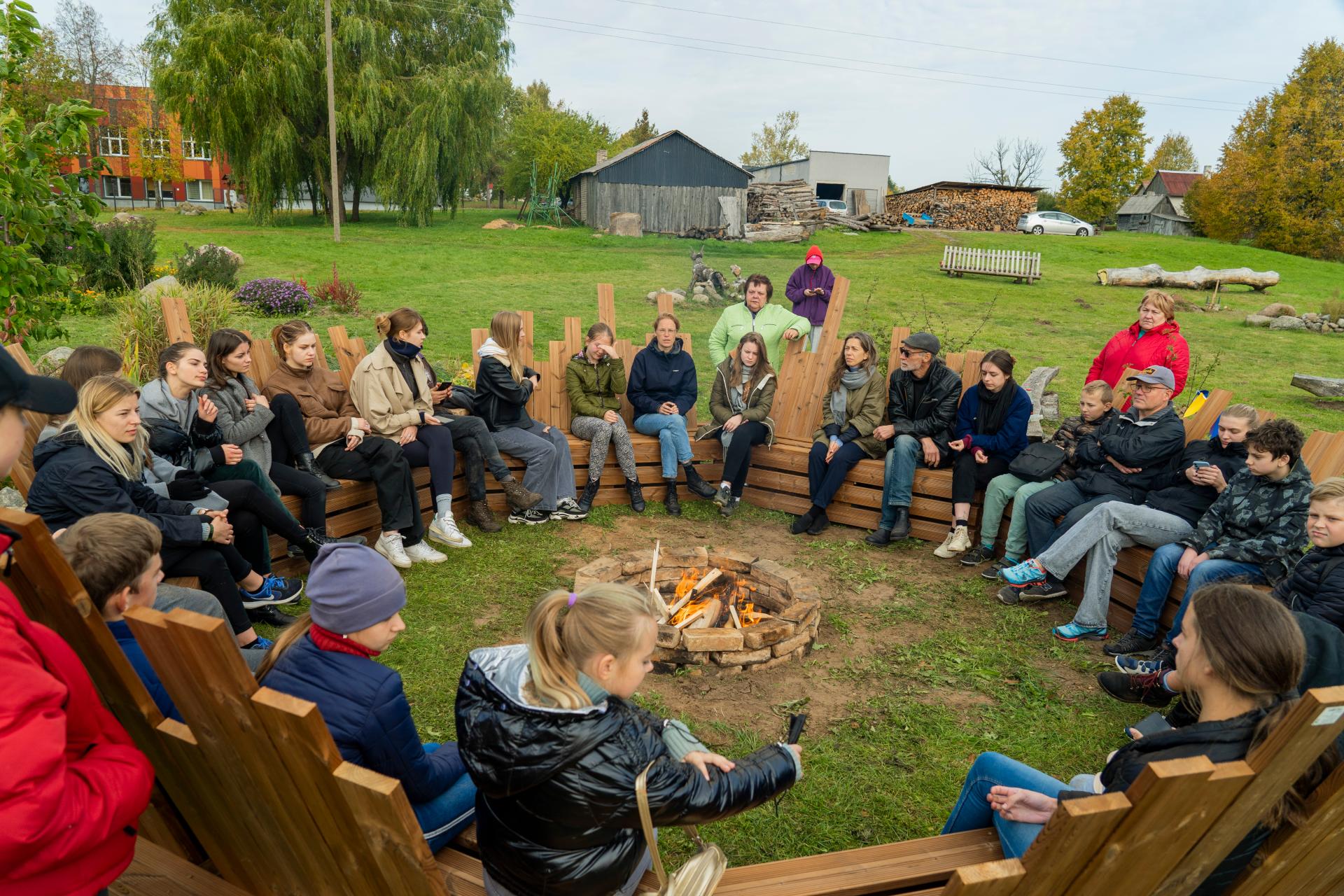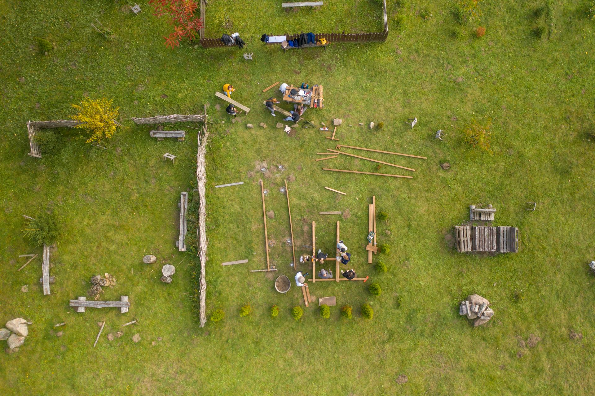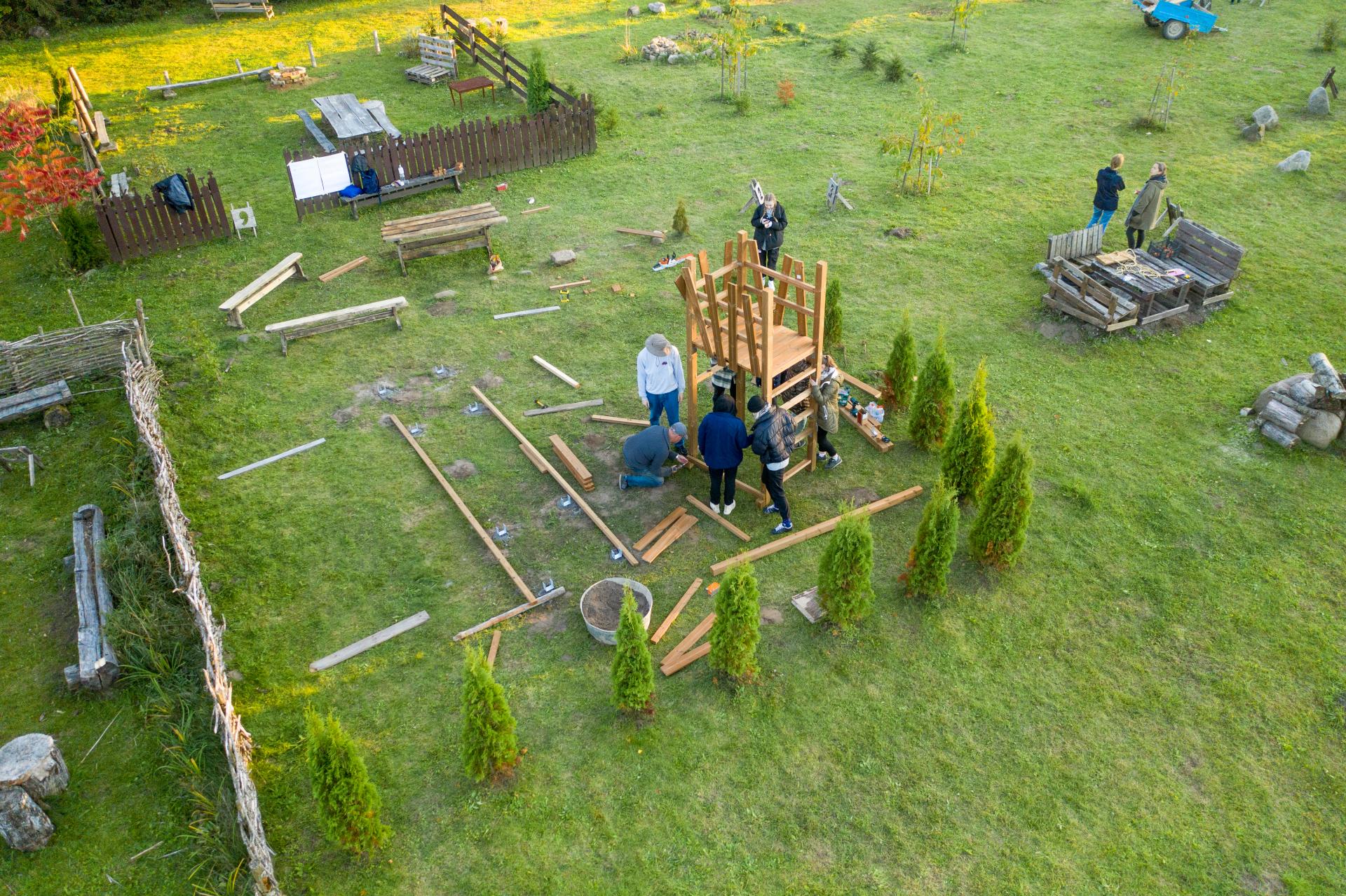 Specific "School Yard in a Different Way" project case in Nevarėnai village has been accomplished while using TAW methodology and practice. Implementation and involvement happened in both process and realization part. The outdoor learning spaces were initiated by the school administration in 2016, but they are all based on the ideas of children and young people, realised together through technology, art or science lessons, and extracurricular activities. In the autumn of 2021, the development of outdoor learning spaces was continued and “Travelling Architecture Workshops” (2 architects), 2nd year students (24 persons) of the Department of Interior Design of Vilnius Academy of Arts and their professors (2 architects and 1 professional carpenter) joined the process and local community of 35 pupils, 2 teachers and 2 school staff. Together they have created and built 4 unique objects.