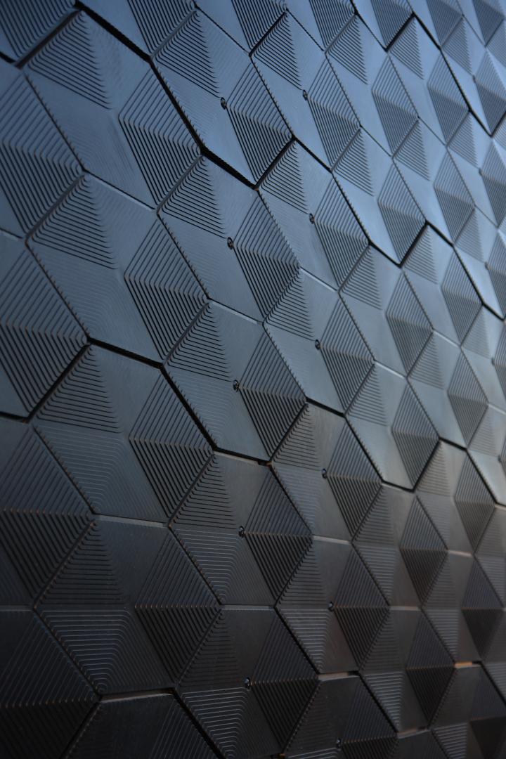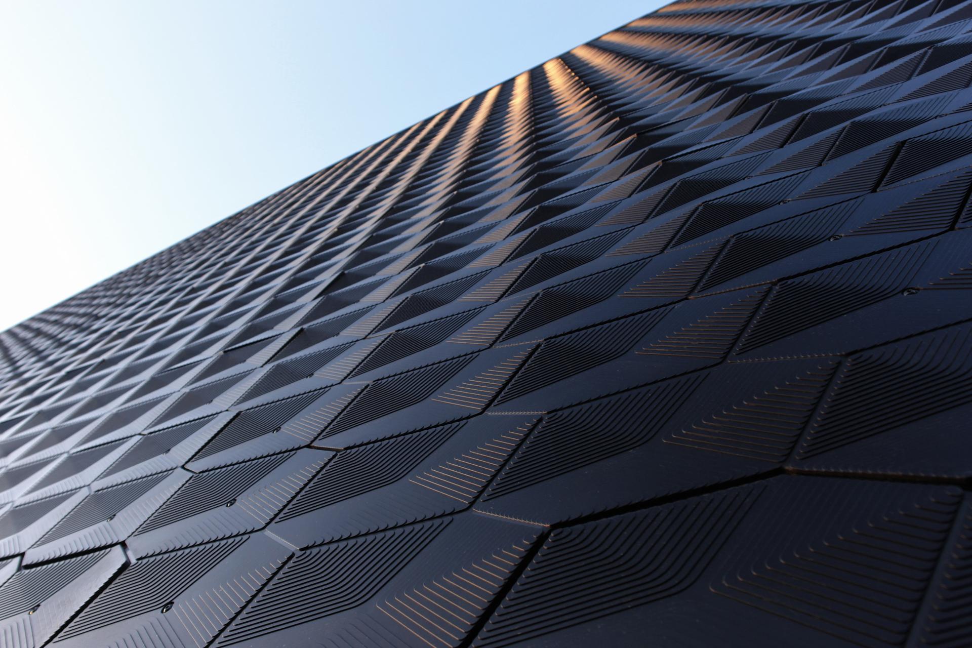 The HexAudi façade application on the exterior cladding of the Audi car dealership in Trudering is a Made of Air biochar-based carbon-negative material rainscreen panel. In partnership with Audi, Made of Air created the compound, developed the final design, manufactured the boards, designed the application process and oversaw the installation of the panel onto the building’s exterior façade.