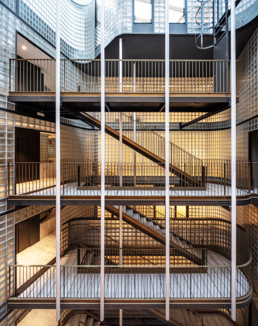 This is done through the opening of two lanterns-courtyards, concentrating the necessary voids in a new curvy geometry courtyard. This is thought of as modern, transparent, luminous space, open to the sky. As a building heart, it provides character to the homes and the public mew. It is built in glass blocks, translucent and bright. Private access and public common spaces are open to this new conceptual hollow, sharing its condition.