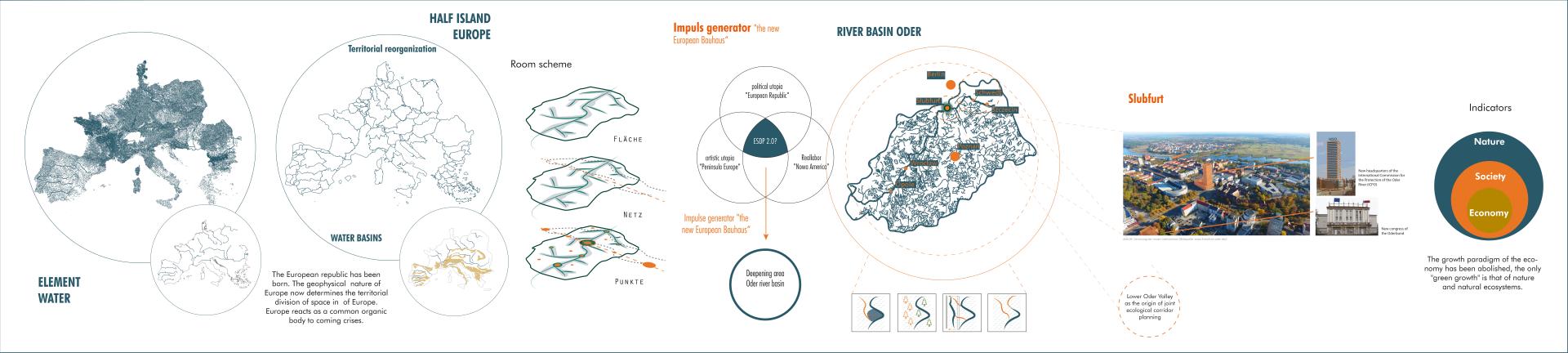 In the newly designed utopia "Nature lead ESDP (European Spatial Development Perspective)" the currently existentially endangered resource water becomes the spatially defining element of the European continent, the river basins are highlighted as new territorial planning units for protection against floods and improvement of water quality.