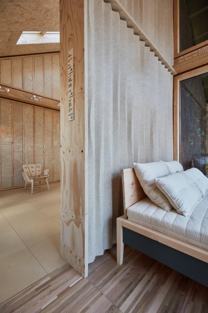 We chose the shape of a house because this appeals towards a bigger audience the most. They can not only see the materials in real scale, they can touch and smell them and feel what it means to build sustainably.