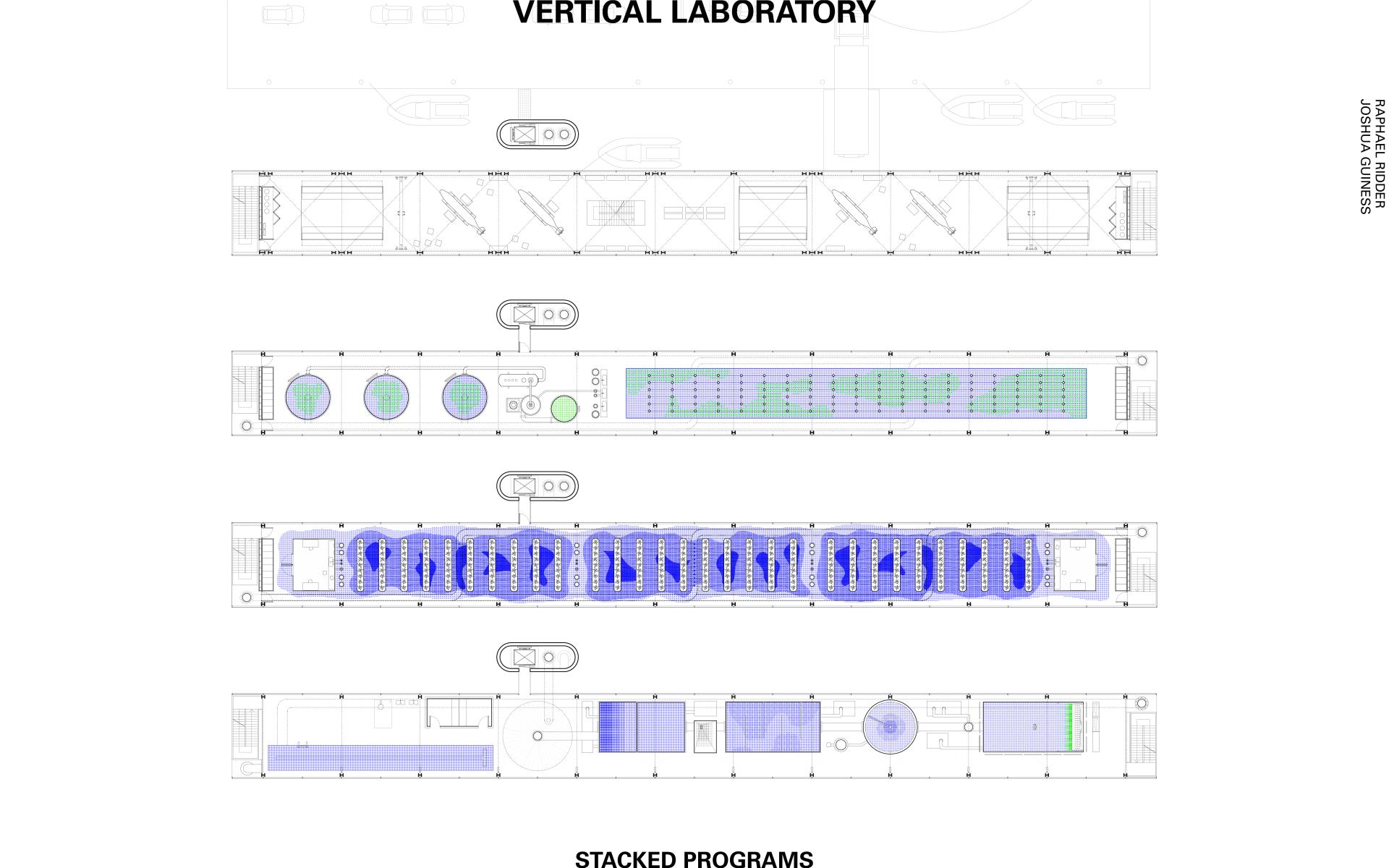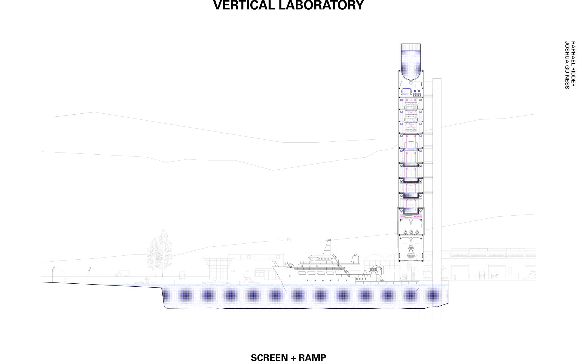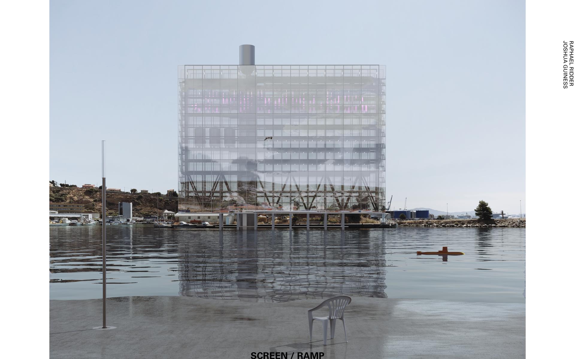 The site is located in between the industrial port of Marseille and the recreational marina of the city of L’Estaque to the northwest. The proposed new building counteracts the cut off position of the de-industrialized port by means of a tall and slender structure whose visual impact exceeds the limits of the site. Its glazed facade acts as a screen, an abstract communication device in the coastal landscape. By combining diverse infrastructural and technological programs within a single volume, a contemporary landmark for the sea is created. Fresh salt water is circulated vertically through the screen in order to create a stratification of different micro-climates. Different spatial atmospheres are created by the verticality of the volume and a gradient in the facade, acting as a filter and re-enforcing the exterior climatic conditions. From bottom to top, the glass goes from dark green to transparent while the exterior reflection decreases, gradually allowing more heat to accumulate towards the top while the lighting changes in intensity. Temporary living units mix with laboratories and working space. Domestic situations intertwine with marine research as water circulates through the different climatic regions of the building, creating a variety of different interactions with its surroundings and the inhabitants. Life inside the building is subordinated to climatic shifts and the ecologies created by them. Inhabitation becomes transitory as it adapts to the changes in climate and seasons, producing migratory flows through the strata of the building. From the outside, the translucent screen acts as a visual medium recording the surrounding maritime climate. Dynamic movements of clouds, atmospheric changes in light, and the shimmering of sea water are reflected in the glass and superposed on to the building’s interior. Seen from the public ramp facing the building, the facade enacts an aesthetic spectacle that re-enforces the connection to the sea and its ecosystem.