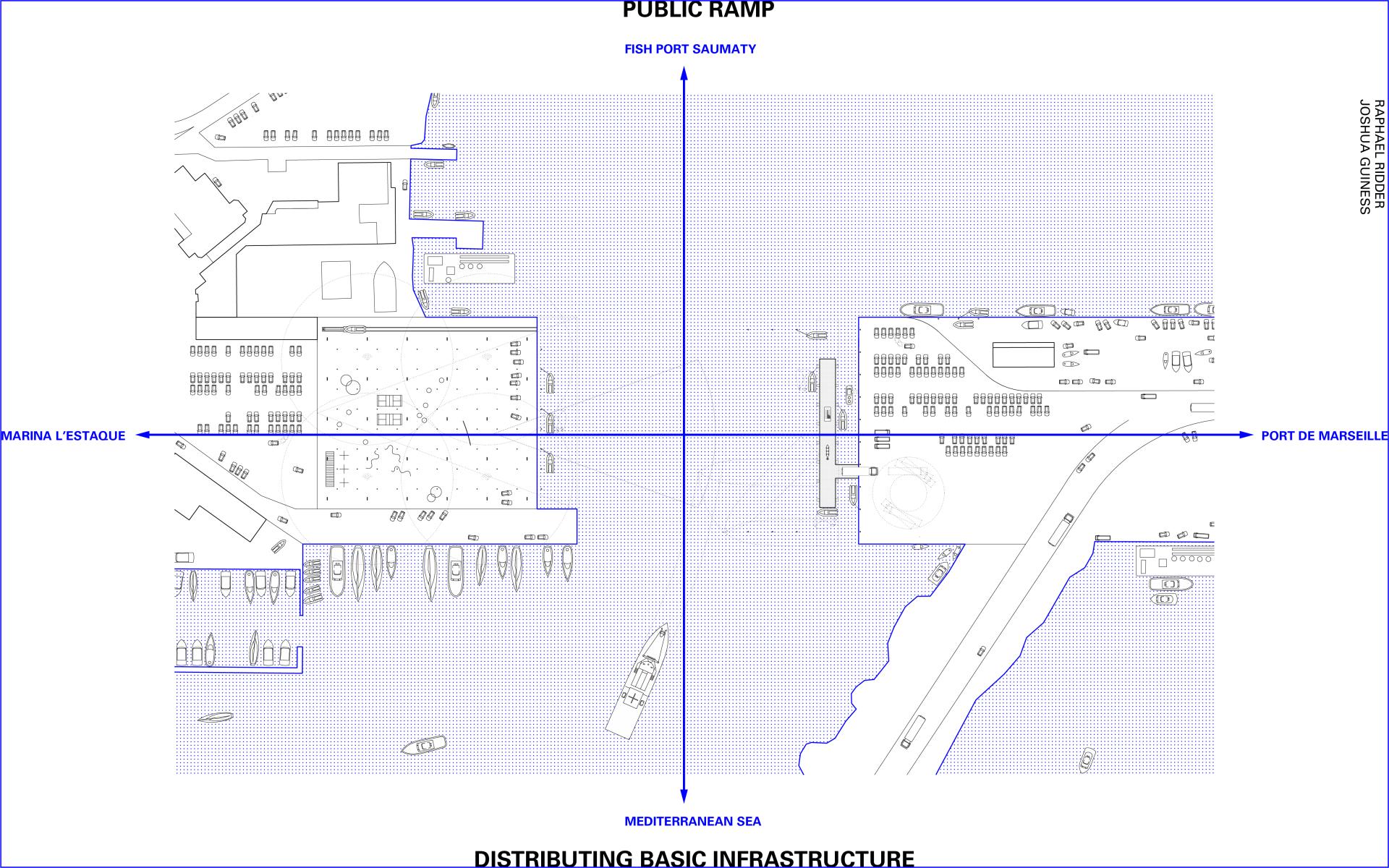 The former fish port is envisioned as a vivid public waterfront with a mix of different uses and a gradient of accessibility. From simple leisure activity, to low-tech recreational use, to highly sophisticated scientific research, the common denominator cutting across social groups and milieus is the resource at the heart of this place: water. Here, the condition of neglect and indifference to the center of the city that characterises so many of former industrial sites along the coast is converted into a quality. It is this vacuum of usage that allows the site to be re-imagined. Alongside the ecological research center, small scale industry and marine technology development co-exist with leisure ship docks. Labour and domesticity intertwine, industrial use and nature mix, and hard-core functional infrastructure meets vast open space and freedom. In re-defining the relationship with its immediate surroundings, two interventions are placed on both sides of the water, establishing a vis-á-vis between the small town of L’Estaque and the port of Marseille. On the side of the small town’s marina, the public ground slopes into the water, creating a concrete beach that can be appropriated through a variety of activities. Different infrastructural plug-ins are equally distributed over the ground, providing water access, electricity, lighting, and internet coverage. On the other side, the marine research center hovers above the water as a translucent screen. The large, publicly accessible slope becomes a space of encounter for nearby communities, establishing a direct connection between the local society and the global relevance of water as a natural resource. By juxtaposing the local and the global, the access to infrastructure and the waterfront are made tangible as common goods open for negotiation.