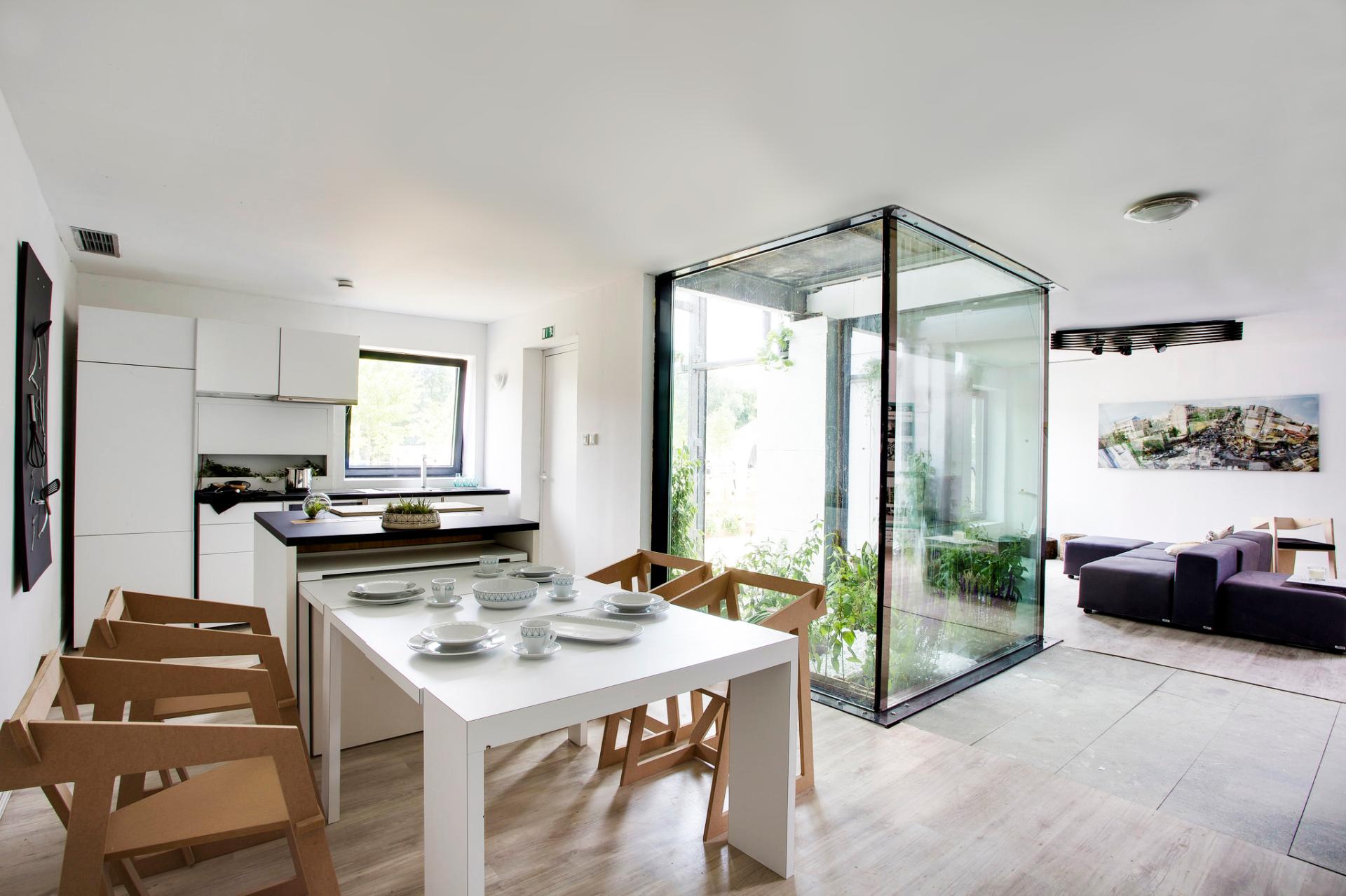 In one of the displayed house prototypes we have chosen to integrate a greenhouse indoors to prove that you can have an impact on the lack of green space in the city and urban densification merely by your choice of housing and the process of building it. The idea of integrating green space in one’s home, in addition to improving psychological comfort, highlights the importance of creating a sustainable community.