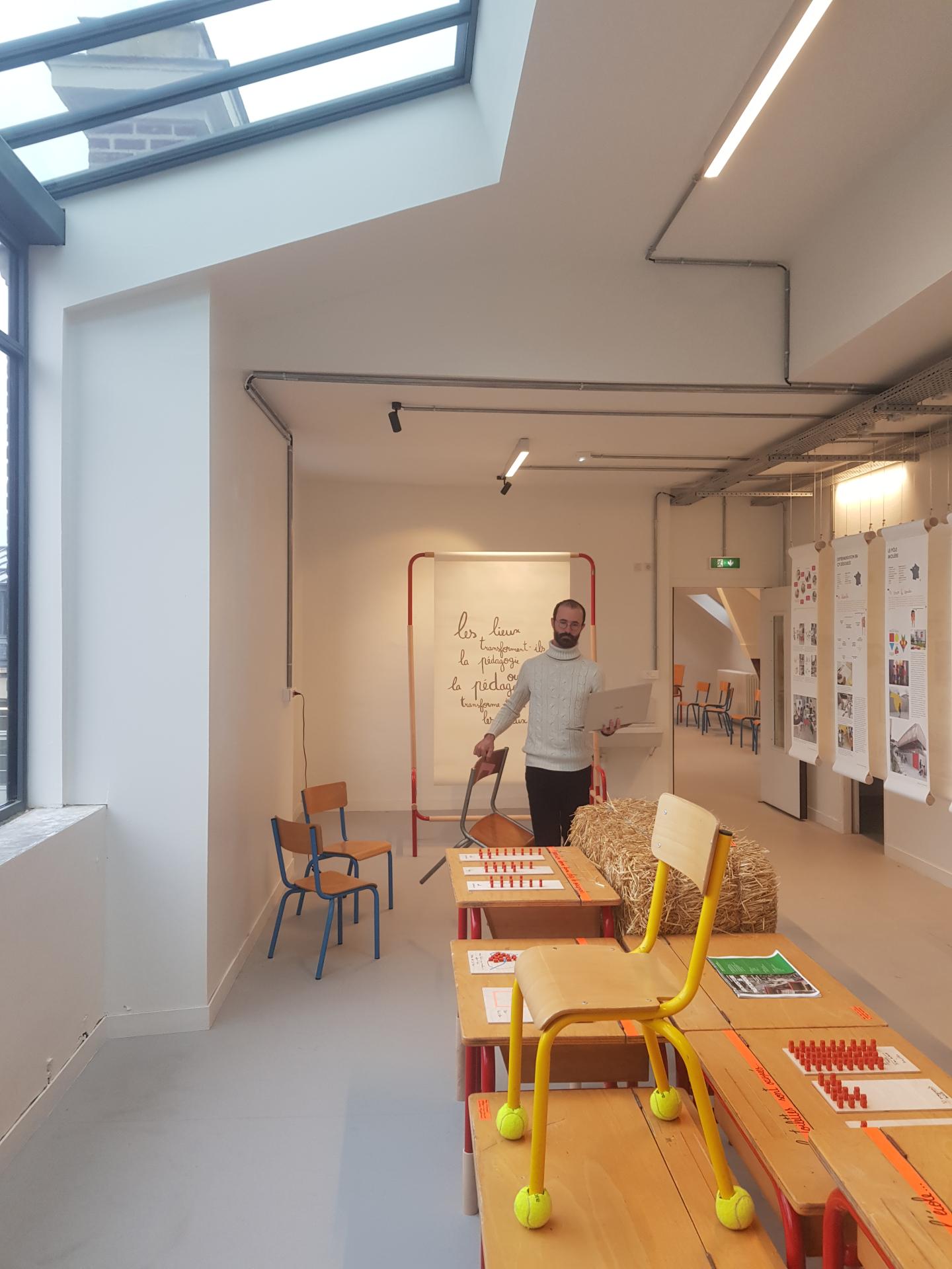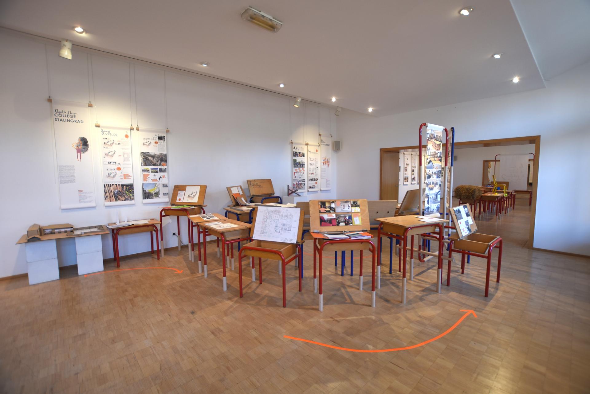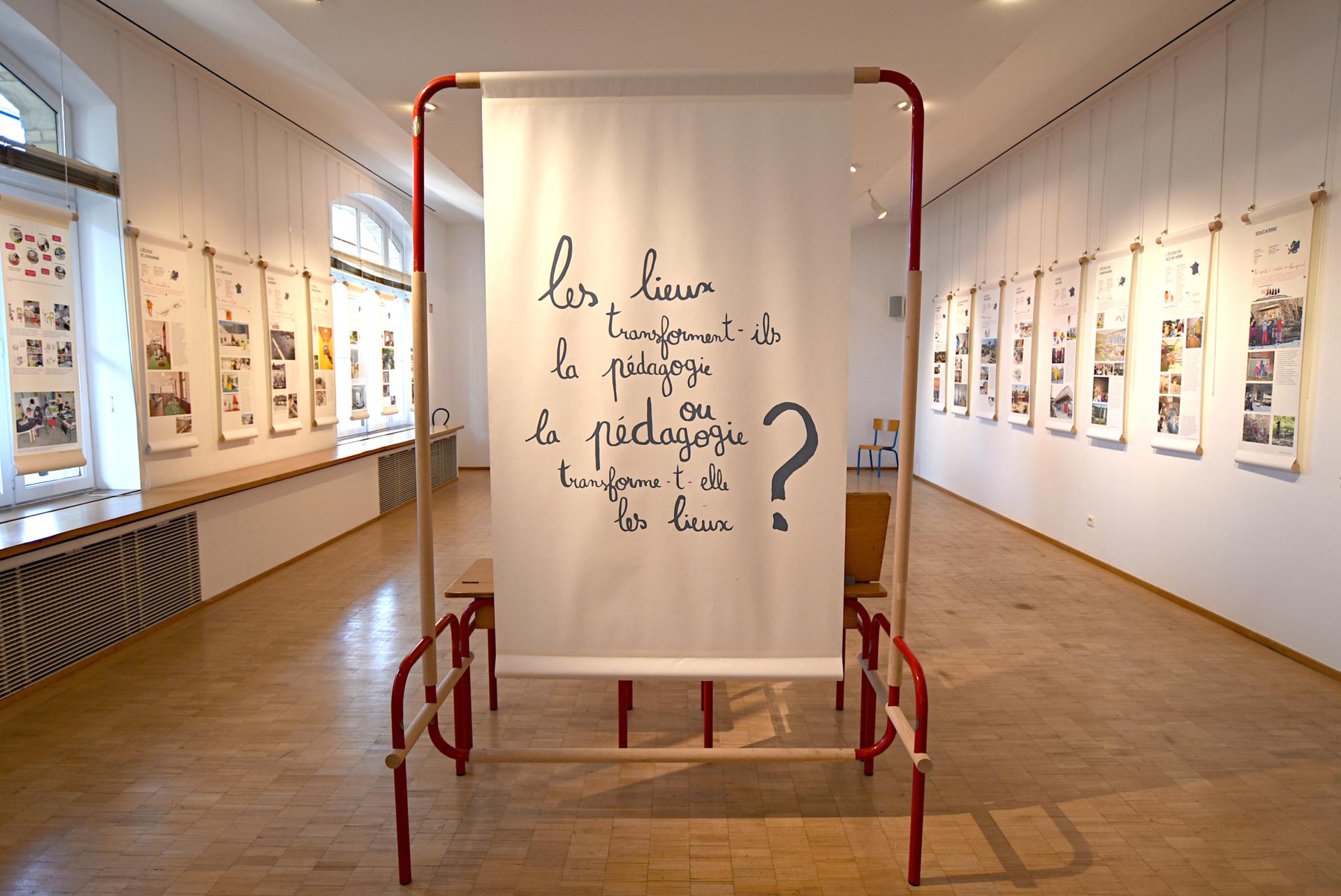 The scenography of the travelling exhibition Travaux d'école is based on the reuse of school furniture. Its modules can be adapted to different locations and the exhibition can be composed according to local issues. The exhibition presents local and international renovation initiatives in the school environment. It shows that the involvement of all the users of a place (teachers, pupils, technical staff, etc.) in a strong collective creative action is the guarantee of the durability of the works. These users are also local actors.