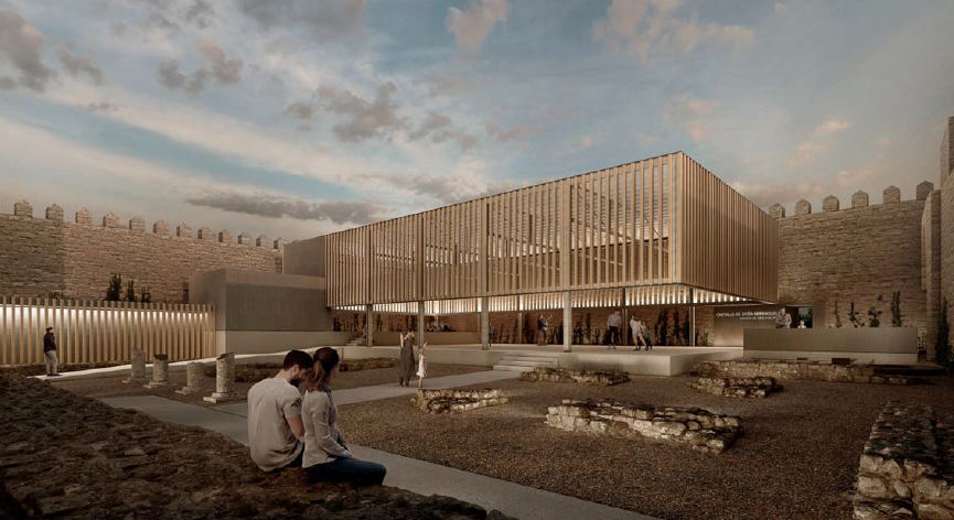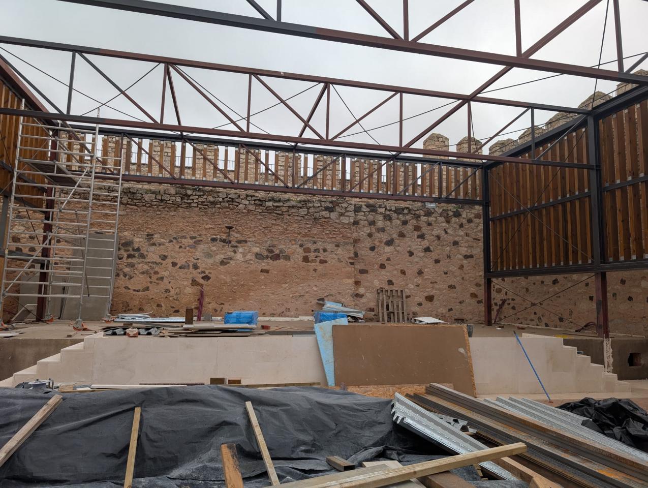 A light covering is proposed, with wooden slats on the upper part and open on the lower part, so that a transparency is produced along it that allows the wall to be understood as the delimiting element of the interior space of the castle, while at the same time the scale of the space is humanized. This arrangement allows the only closed spaces (toilets and dressing rooms) to be grouped into a set of volumes that does not interrupt the aforementioned transparency. The volume of the toilets is protected with a canvas of wooden slats similar to those of the volume of the stalls. At night the interior lighting of both slatted volumes would function as a light fan that would be projected onto the archaeological remains and onto the interior stone walls of the castle walls.