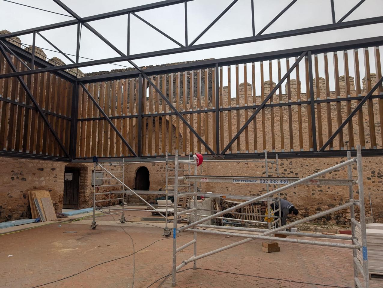 It constitutes the permanent support structure of the textile cover that reaches the height of the walkway level. The structure approaches, without touching, the south and west walls of the wall and will separate from the east and north walls. The separation strip with the west canvas incorporates a garden space with the wall as a visual background of the scenic space.