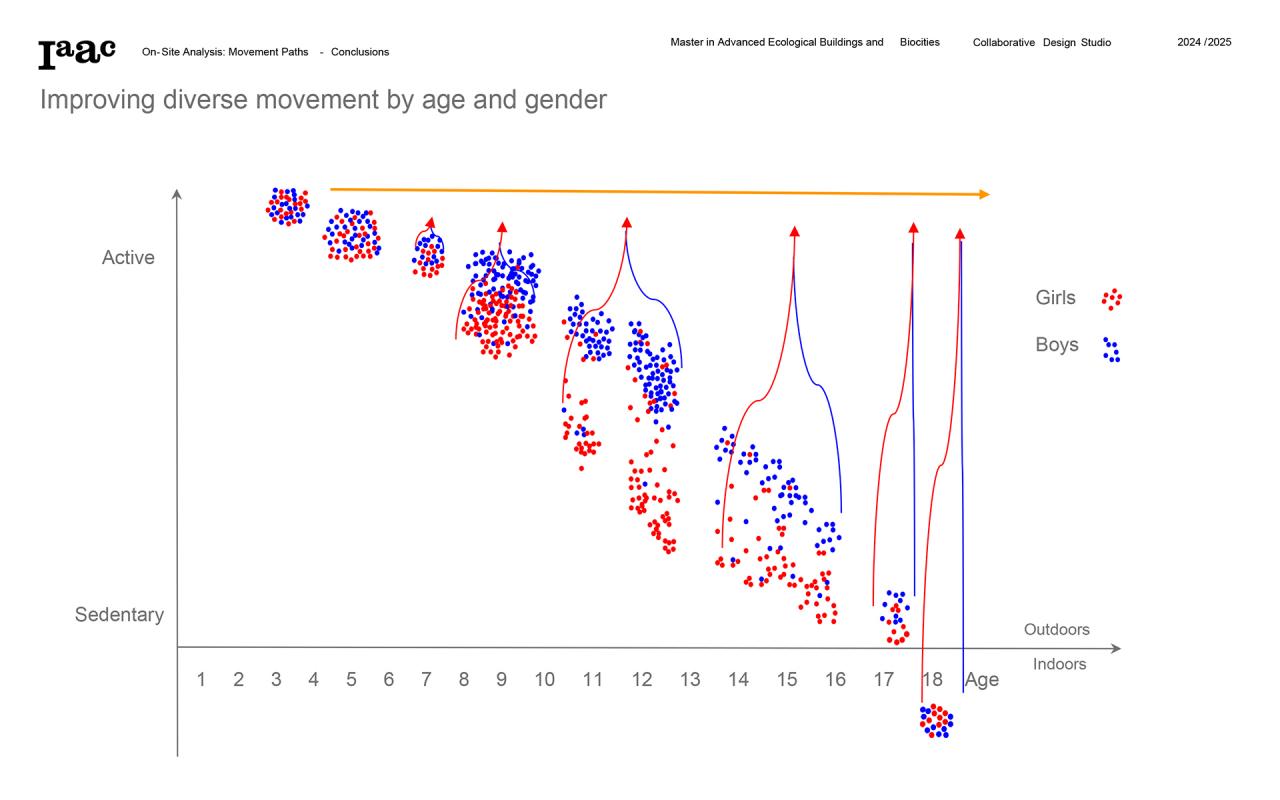 A key insight from this phase was the significant disparity in how boys and girls, as well as more or less active children, used the terraces. Mostly boys, particularly those interested in football, tended to dominate the larger areas, while girls and less active boys were often relegated to the edges of the terraces or excluded from certain spaces altogether. This disparity became more pronounced with age.