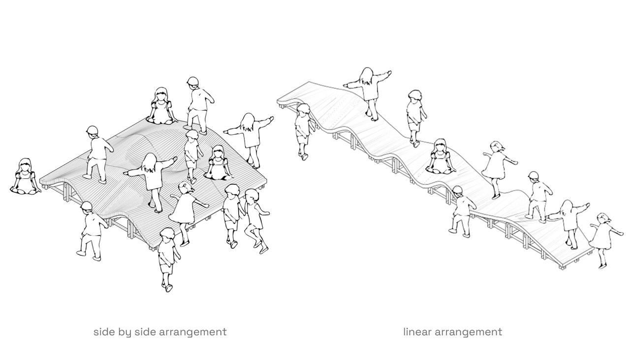 Kindergarten Terrace: Redesigned to reflect young children’s diverse movements, such as jumping, climbing, and crawling. The design consists of three modular units, each measuring 1 meter by 3 meters, which can be arranged either side by side or stacked in front of each other. These modules create a continuous, angled, and wavy surface. Modular wooden units created dynamic, colorful topographies, fostering creativity and exploration. Lightweight and flexible, these units offered adaptability while ensuring safety.