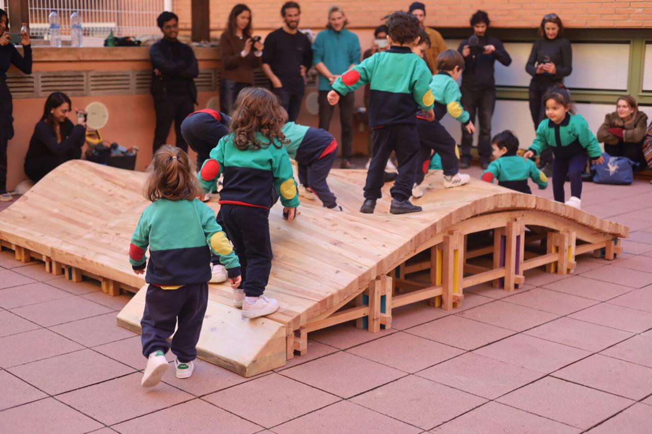 To address these issues, the project “Angels Games: Activating the Courtyards of the Mare de Déu dels Àngels School” was launched. It aimed to transform the school’s bare terraces into vibrant, inclusive, and climate-resilient spaces. This initiative focused on creating environments that promote well-being, address spatial inequities, and encourage healthy development for all students.