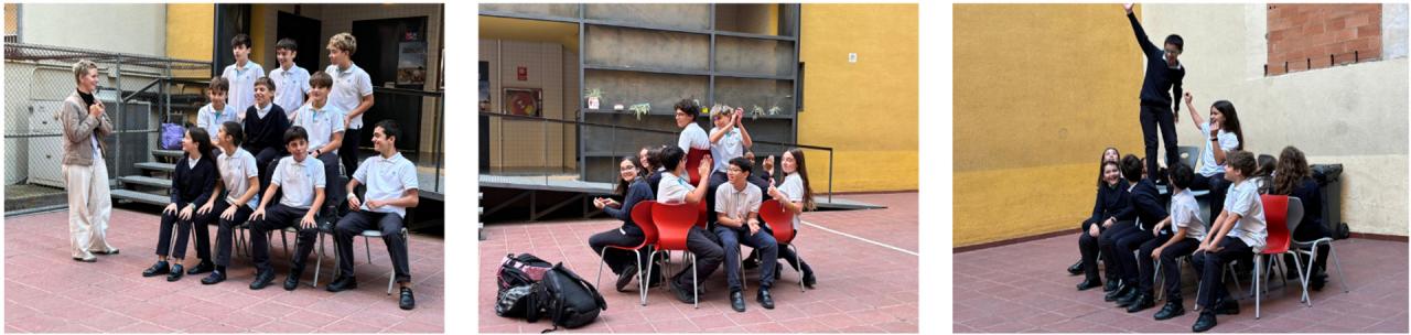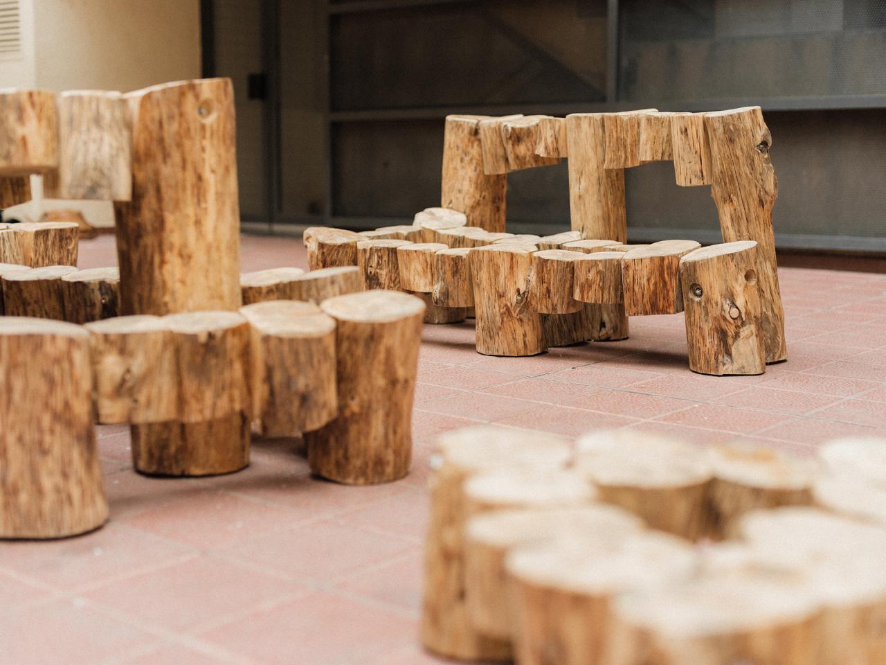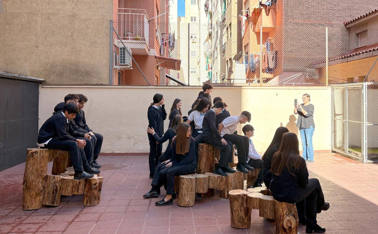 Secondary School Terrace: Responding to older students’ need for seating, movable wooden furniture was crafted from locally harvested pine from Parc de Collserola by the students. The tree trunks were cut to varying heights, stripped of their bark, and securely joined using steel rods and nuts. The edges of the trunks were carefully sanded to ensure comfortable and safe seating. The modular design allowed students to rearrange seating, fostering agency, adaptability, and interaction in a multifunctional space.
