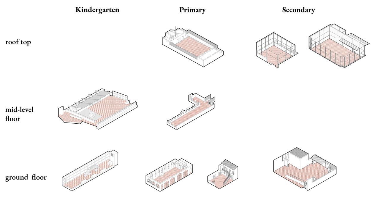 Three terraces - kindergarten, primary, and secondary- were reimagined to address the unique needs of each age group:
