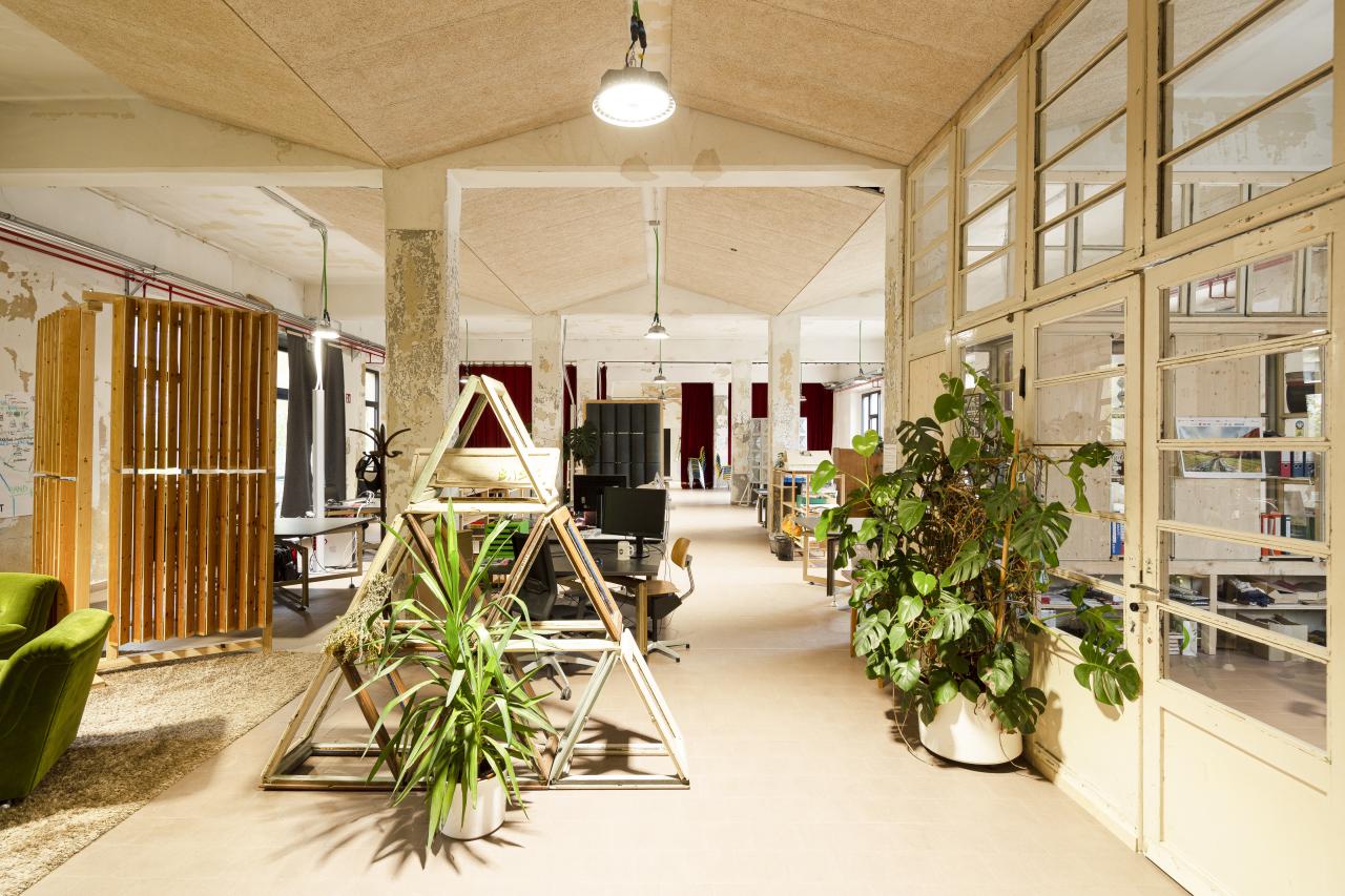 SUSTAINABLE: From the outset, BASIS prioritized reuse over demolition, minimizing waste and emissions. The original structures and local materials were preserved and creatively upcycled (see Multiplo, 2019). Moreover, workshops and consultancy services actively support the district’s green transition, e.g. including a €4M green communities project (PNRR) written and managed by BASIS. Furthermore, an EU project (DUT-CoPed) that will support the energy-sustainable development of the hub is starting.
