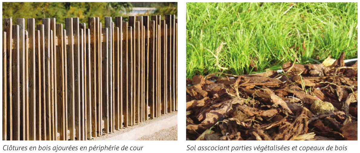 For the school yard, the furniture is wood, the soft floor is made of cork and the structure of the plastic courtyard is replaced by a green one.