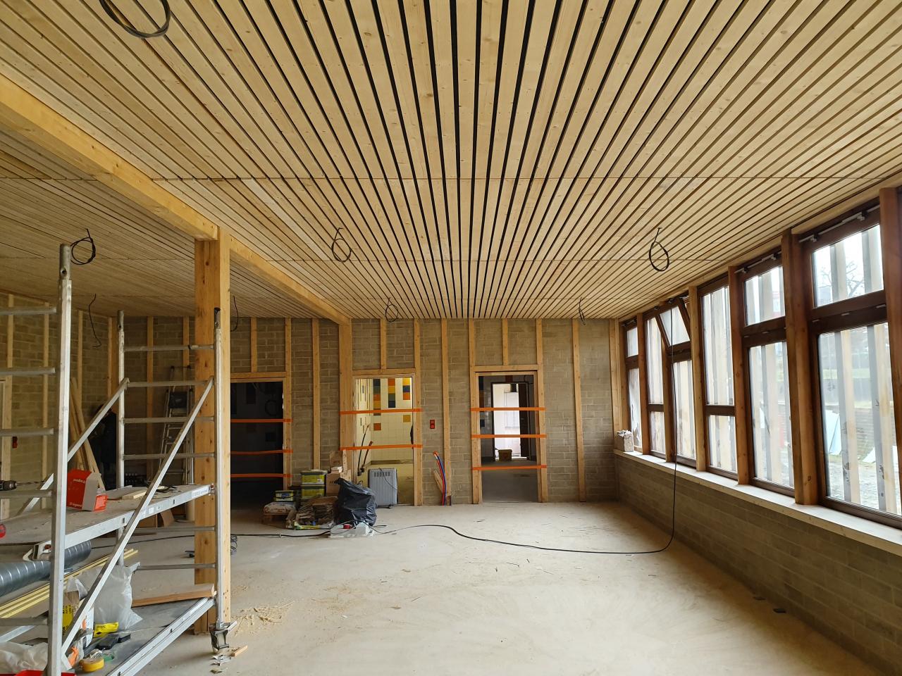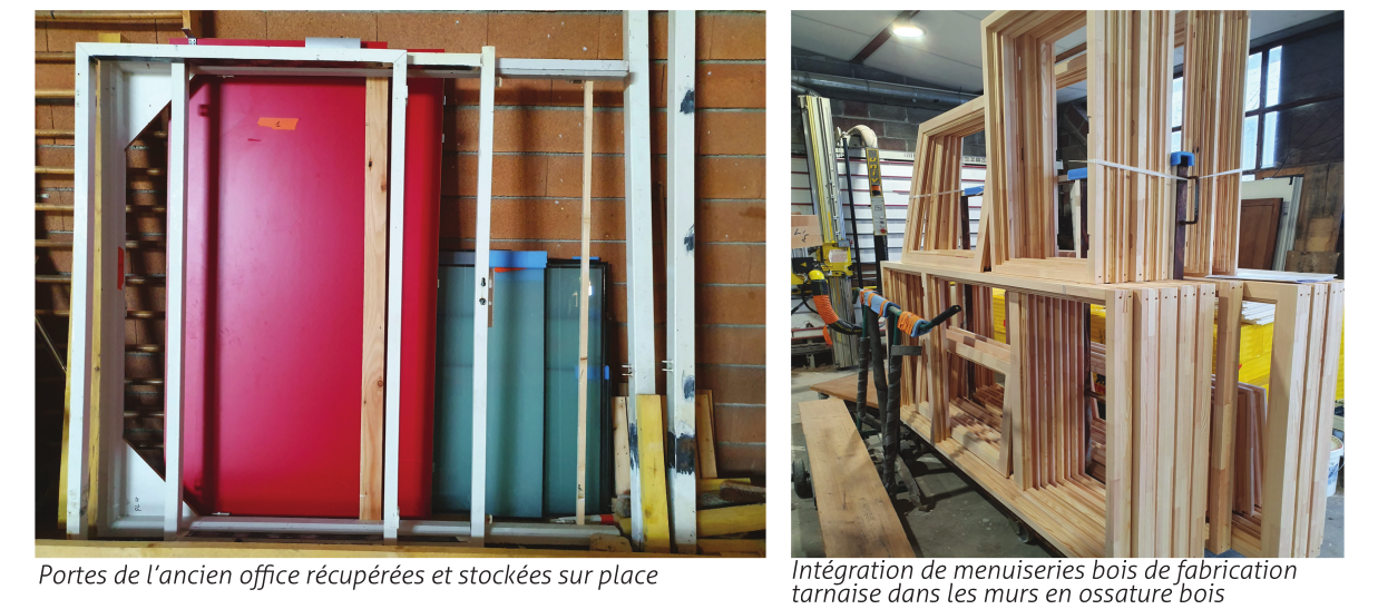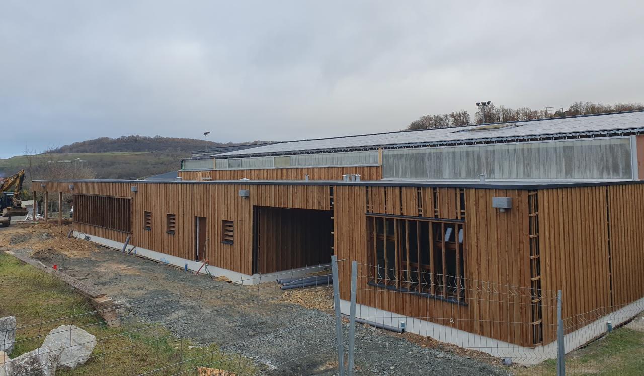 The structure of the canteen building is wood, the insulation is in wood fibre, the walls are in raw earth, the floor is a coating from the vegetal.