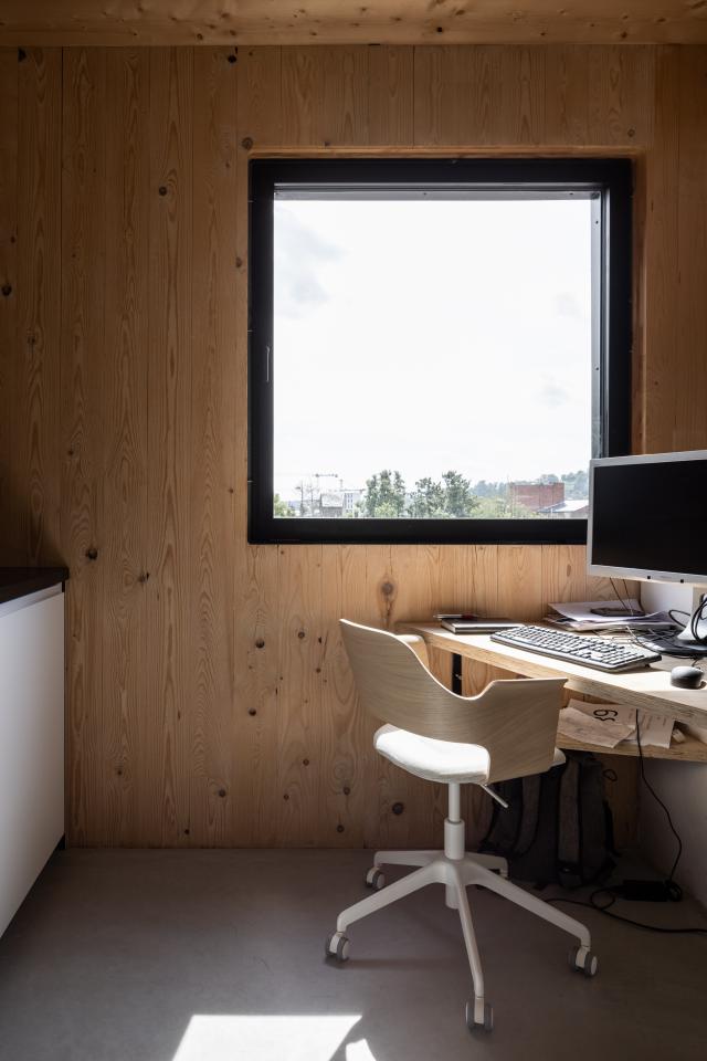 Set back from a green street, the ground floor features professional spaces and communal areas with large openings to the garden. Residences, built in CLT (cross-laminated timber), span two levels with an open-air passageway ensuring optimal views and sunlight. A rooftop terrace offers panoramic city views. Each home includes private areas (kitchen, bedrooms, living room, balcony) while benefiting from modular common spaces that encourage interactions.