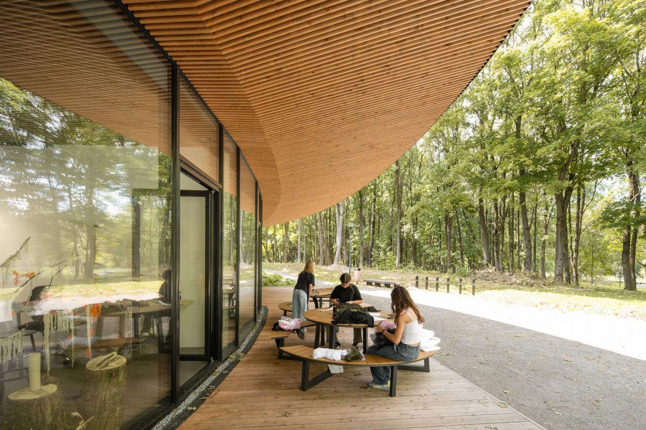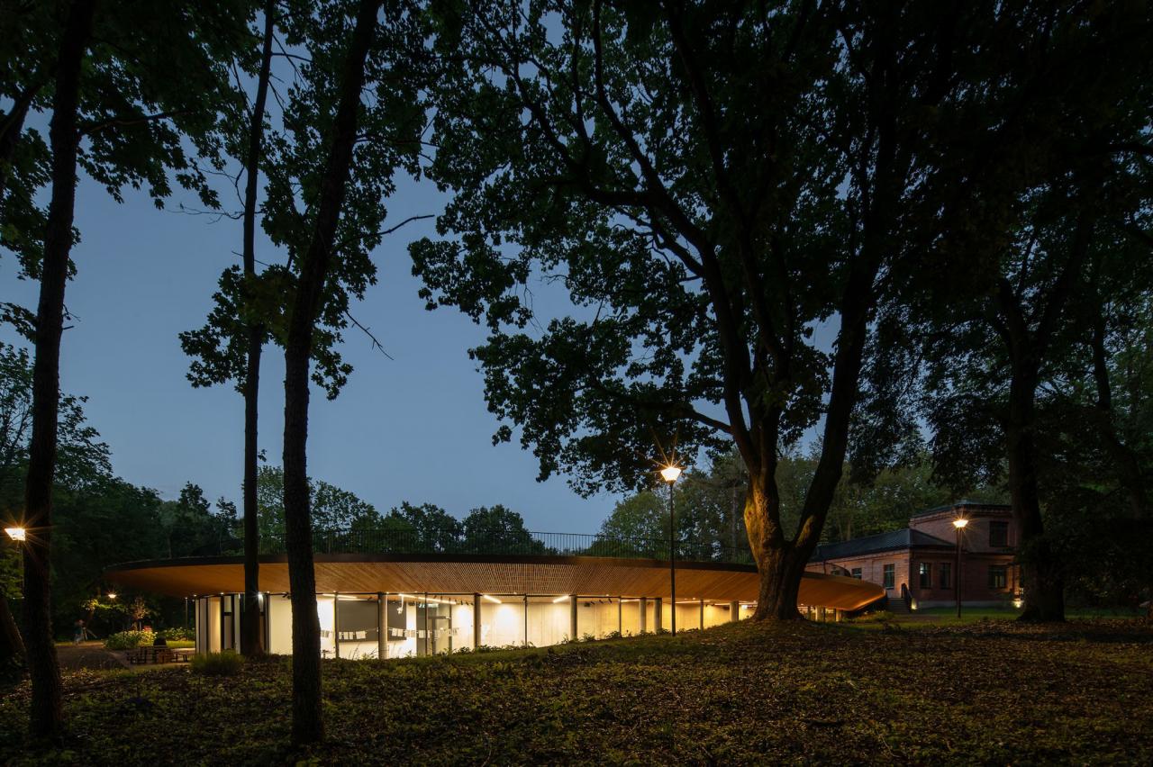 The architectural firm PUPA / Life Over Space won the competition to restore the manor and redesign the park. The goal was to preserve heritage while expanding it to serve the community. Restoration maintained historic details—brickwork, decorative paintings, and the orchard—while a modern glass extension integrated seamlessly into the terrain, providing studios, workshops, and gallery spaces. Its curved design harmonizes with the park’s natural landscape, blending history with contemporary architecture.