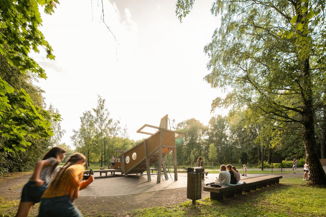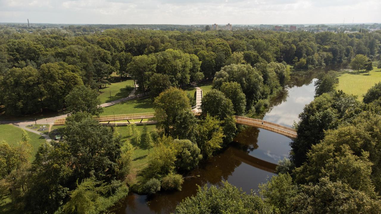 Skaistakalnis Park was redesigned to improve accessibility, nature preservation, and inclusive leisure spaces. New paths and bridges opened hidden areas, while activity zones and gathering spaces revitalized the park. Key features include a terrace for cultural events incorporating historic barn ruins, playgrounds, a sports area, and a community-maintained garden. Accessibility was a priority—the main bridge was redesigned for wheelchairs, strollers, and cyclists, with smaller bridges enhancing connectivity.