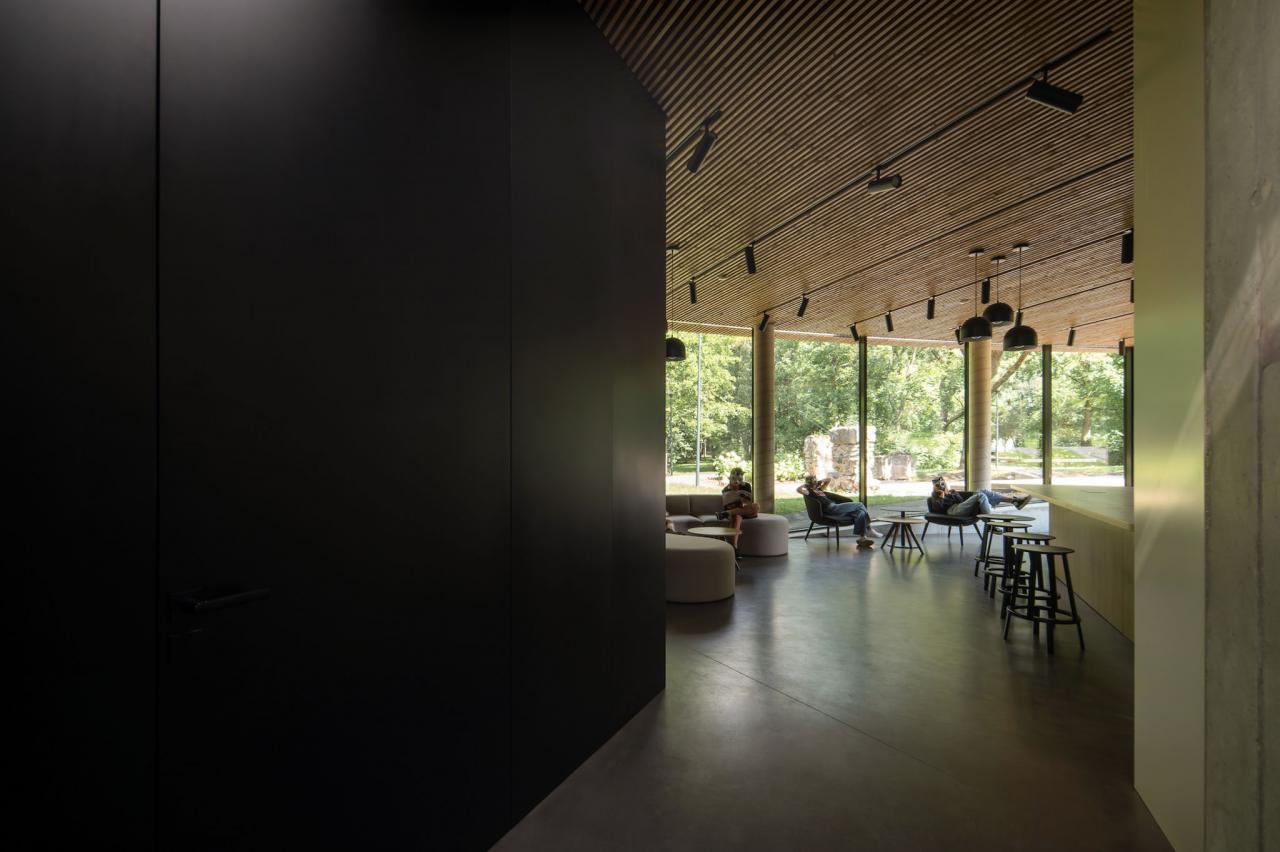 Seamless integration of old and new: The historic red-brick manor was restored, preserving its original details and character, while a modern glass extension creates a sense of modernity. Both parts of the building harmonize with the park’s natural terrain. This contrast between tradition and innovation, brick and concrete, glass and wood enhances the site's visual appeal.