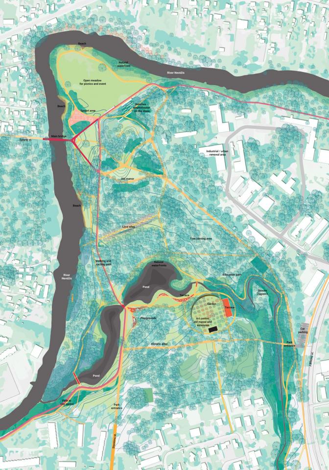 The transformation of Skaistakalnis Park and its historic manor focused on sustainability through heritage preservation, community engagement, biodiversity enhancement, sustainable mobility promotions.