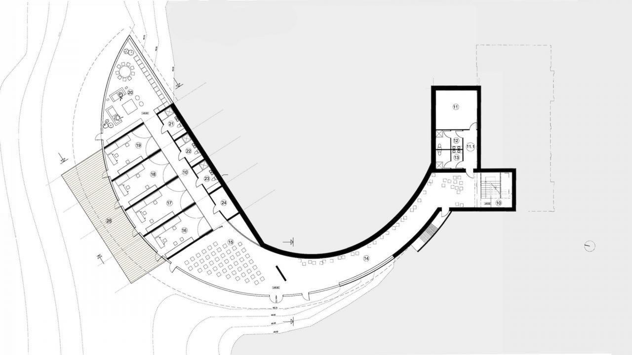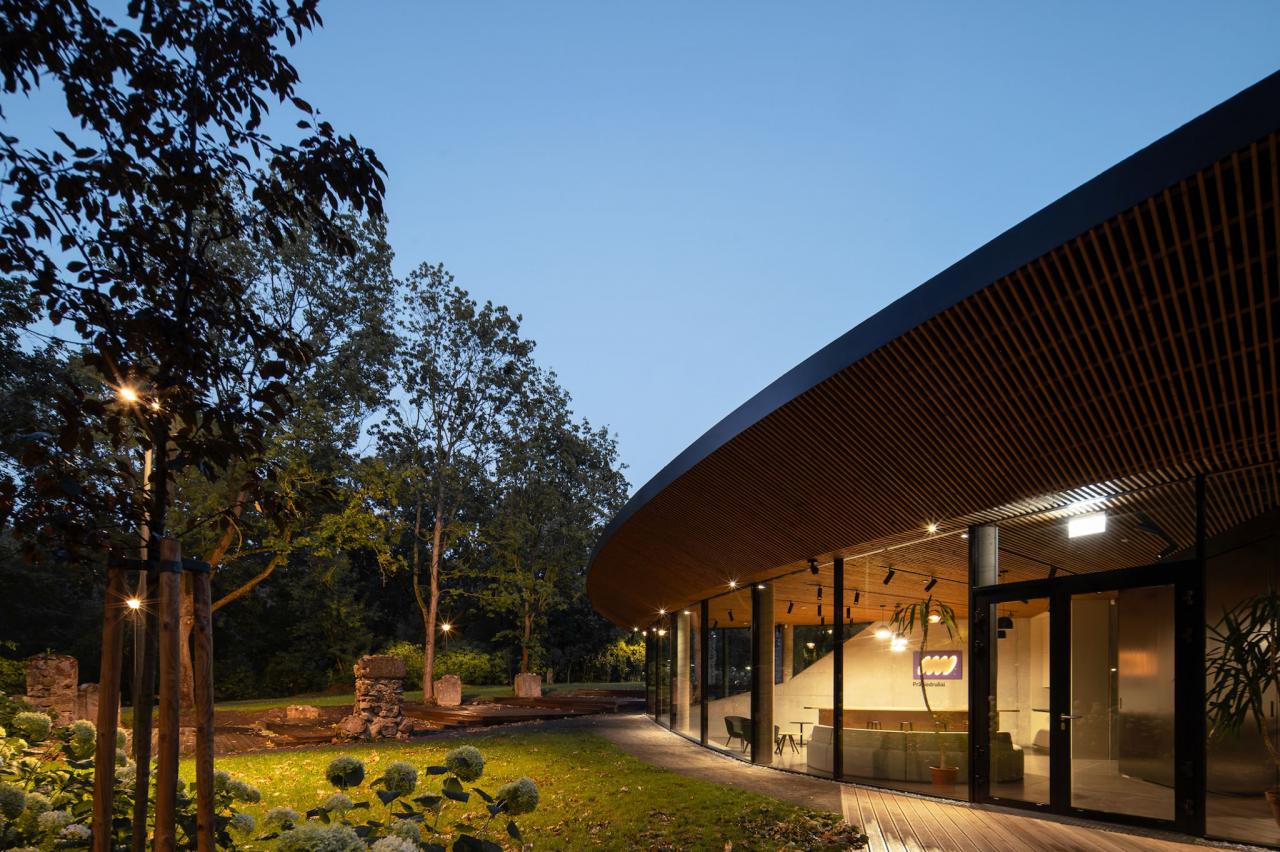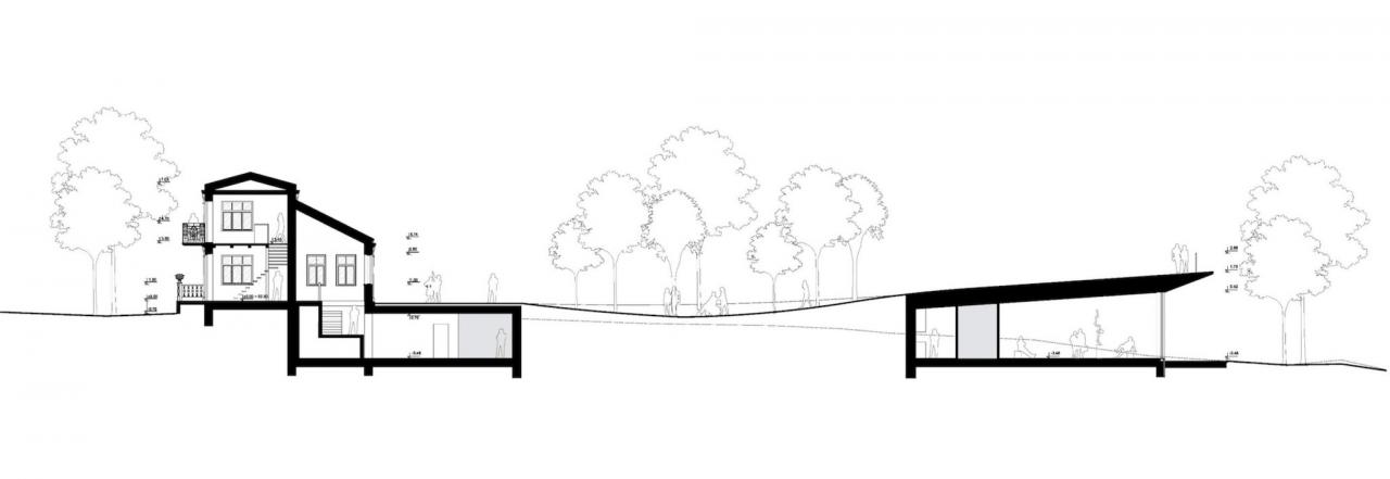 The new addition to the historic manor was designed for minimal visibility from the original road, where only a small roofline is noticeable. However, from the new park connection, the extension reveals a transparent glass curtain wall and a large overhanging green roof, atop which the historic manor stands. This design ensures harmony between past and present, integrating seamlessly with the landscape.
