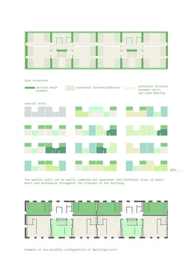 The adaptable and flexible character of the building is named typological flexibility as it it operates in the whole building. The structural concept combine the majority of the load bearing structures and walls with the majority of mechanical services in the service shaft elements. Adjacent to these service shafts the room space can specialize into any kind of room including bathrooms and kitchens. As there are several of these shafts passage that run through the floors that also carry the load of the buildings, there is to some extent overcapacity of mechanical service flues. However, this is the feature that makes the building so flexible that offers endless permutations of different spatial configurations.