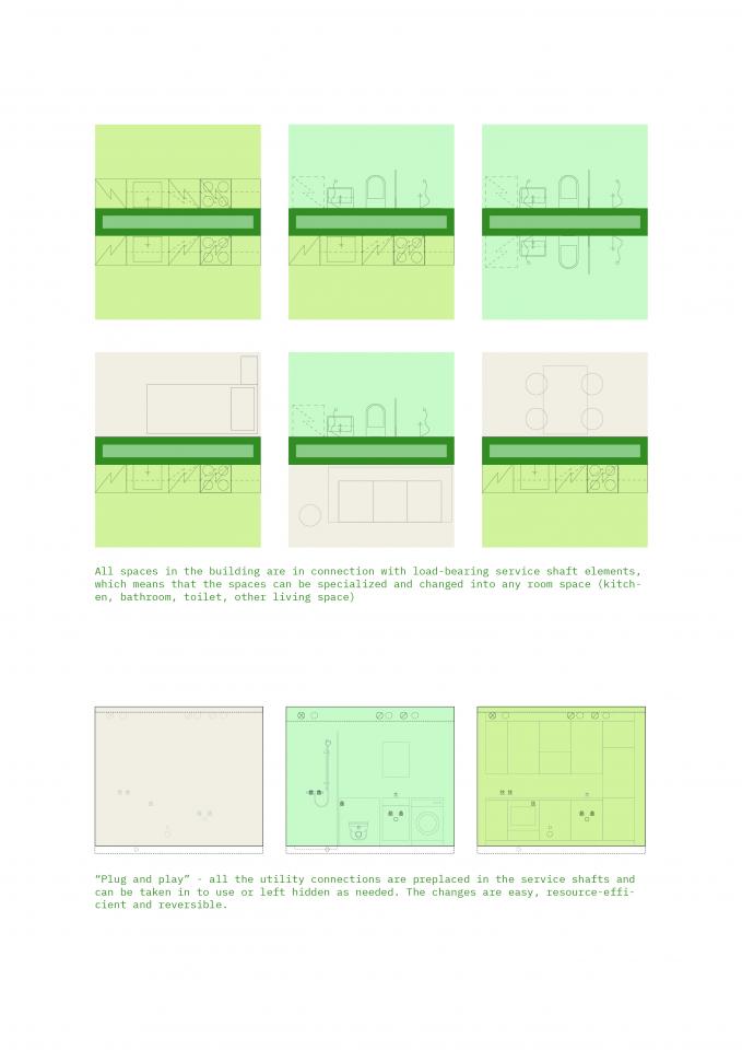 The idea is scalable, and can be adjusted to different sizes of buildings and regulations in different countries and situations. For example, in taller buildings the loadbearing parts are wider, and some of the technical solutions need to be adjusted according to number of floors. The mechanical service regulations in Finland are among the strictest in EU, so there is assumption they could also be applicable to different regulatory contexts. The load-bearing service shaft, containing also the mechanical services, can be serially produced in factory conditions, which also enhances the quality, logistics in construction site, and affordability of the construction in the future.