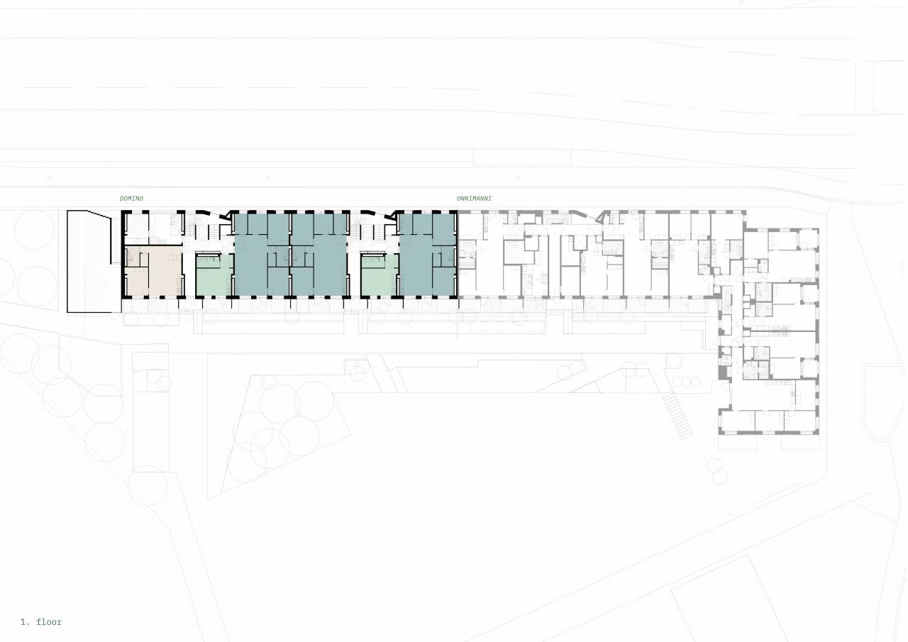 In Domino housing, based on a new kind of spatial unit-based thinking, the spatial units, can be easily combined and separated into different sizes of apartments and also workspaces. As a rule, all spaces in the building are in connection with load-bearing openable service shaft elements, which means that the spaces can specialize and be modified into any room space including kitchens and bathrooms. The locations for different room types are free as the mechanical services run mainly in vertical direction. The service shaft elements provide also spatial potential for later changes when building technology develops and mechanical services age.