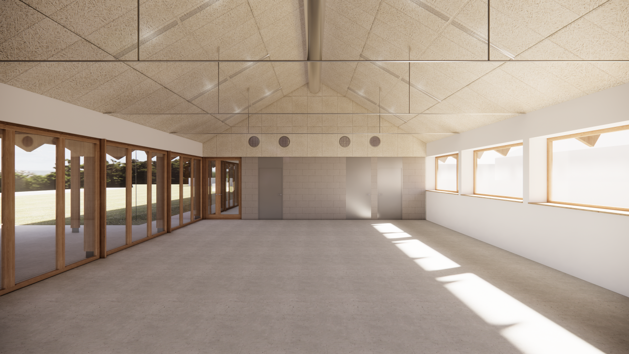The building was designed in the shape of a farmhouse with double slopes. The first features two rooms, sanitary facilities and a pantry, while the second is an open hall. The geometry and volumes of this building blend seamlessly into the village centre. The choice of a total opening with bays on the east side will create a large convivial space, integrating the hall, while on the west side a minimum of opening is planned in order to limit nuisance to neighbours.