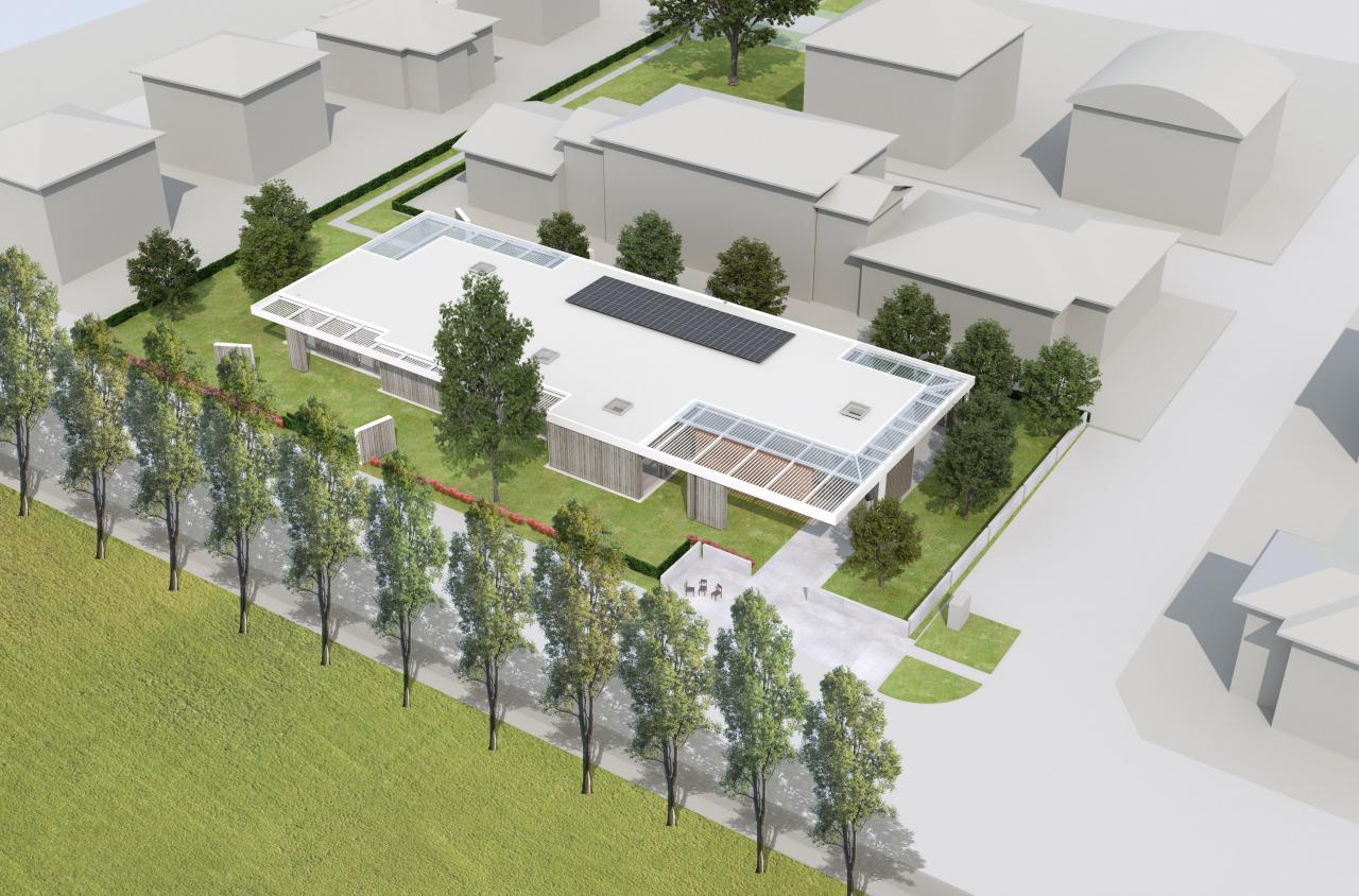 The outdoor areas will largely be treated with permeable materials: the pedestrian paths inside the garden will be made of limestone (stabilized quarry mix) with a non-slip surface. Much of the outdoor area will be made of low-maintenance green lawn and flower meadow, which can attract pollinating insects (bees, butterflies, beetles), thus preserving the biodiversity of the area.