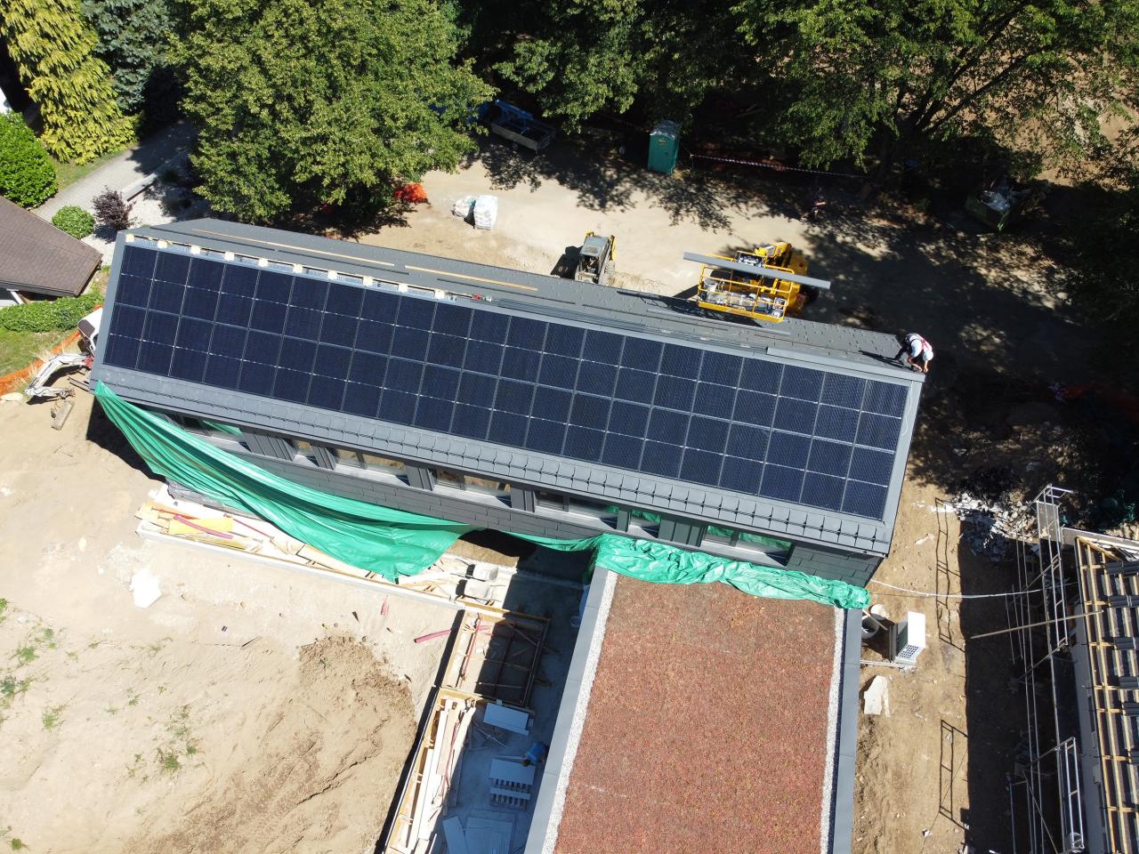 A green roof provides insulation, reduces heat loss in winter and overheating in summer, absorbs rainwater, and supports urban wildlife. Two car charging stations ensure mobility independence.