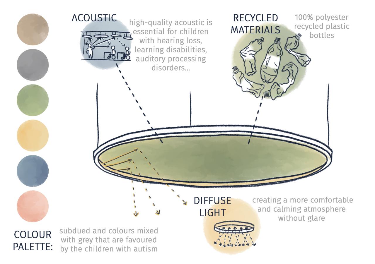 • Use of Recycled and Sustainable Materials: Acoustic lighting fixtures are made from 100% polyester recycled plastic bottles, contributing to a circular economy and reducing waste.