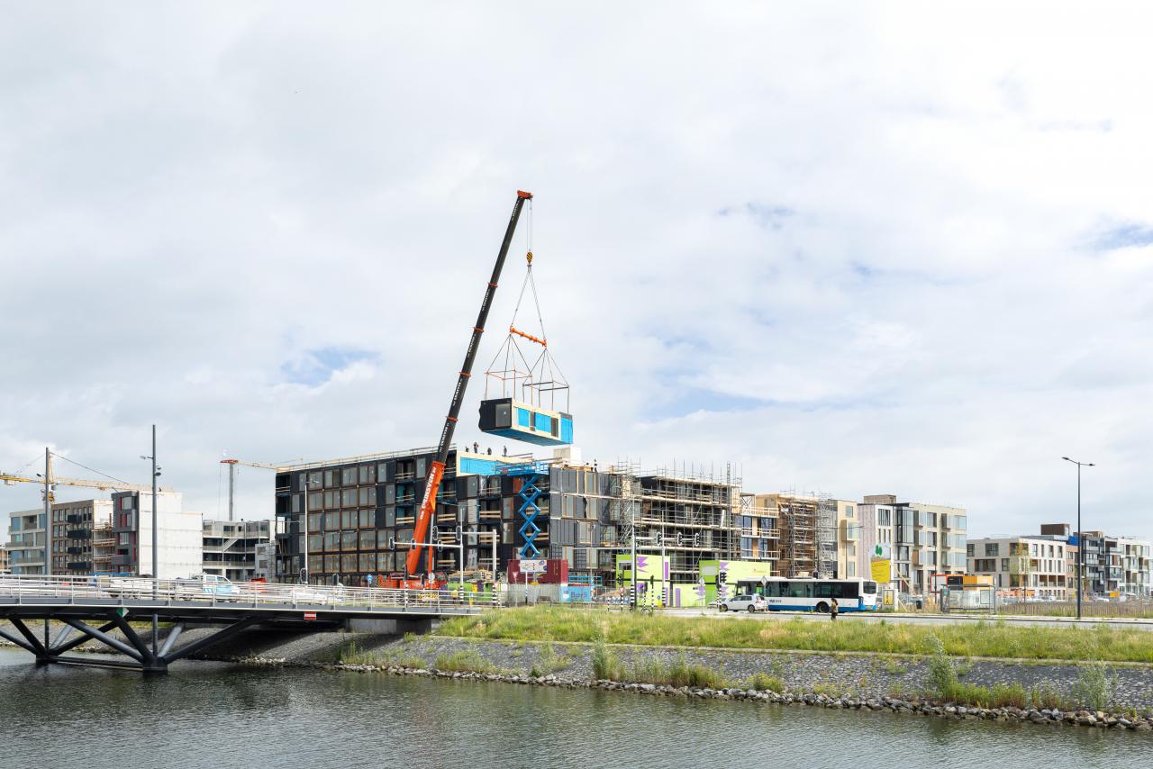 For the structure, the first floor is built as a “table” under which the public plinth is located. The wooden units are placed on top of it and stacked 5 storeys high using a dry construction principle. The responsibility for the substructure lies with the main contractor and the units with the unit builder. By separating the systems but designing them collectively, speed, cost reduction and the right expertise were achieved. This approach also helped to quickly identify the regulation and technical challenges regarding fire safety and acoustics associated with timber construction, allowing the necessary time to explore innovative solutions.