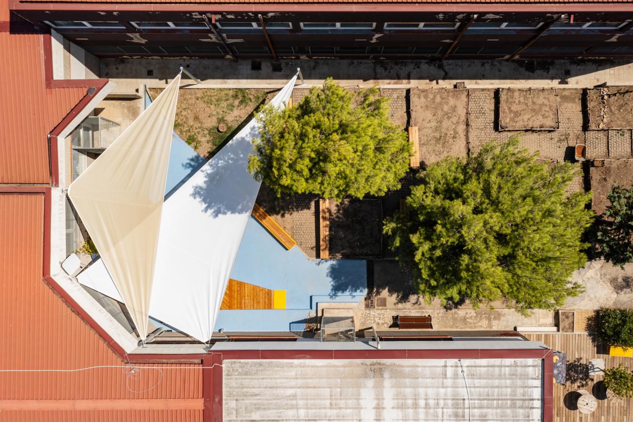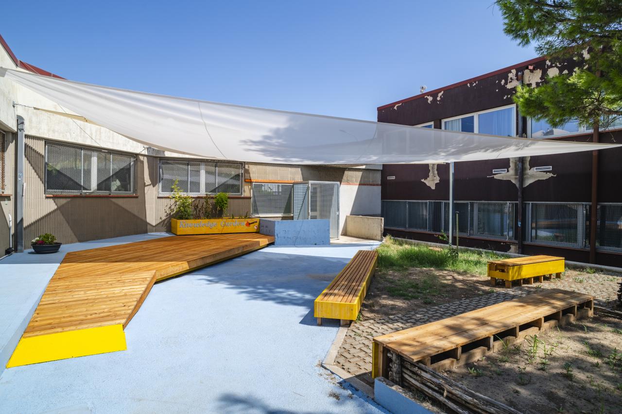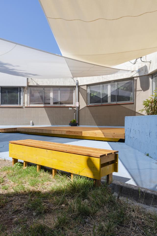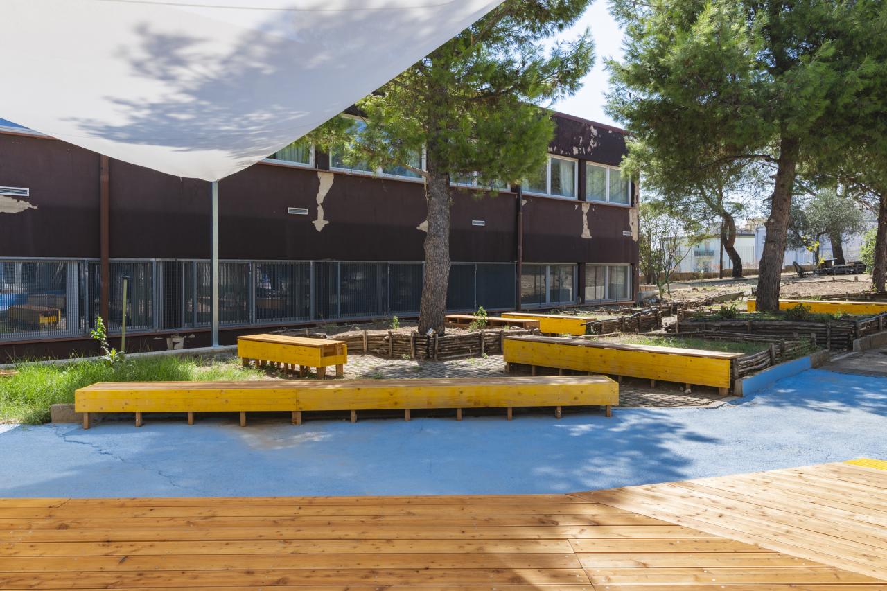 The transformation of the space included four key elements: a light blue quartz paint coating, a platform with seating and plants, two shading sails, and a mix of fixed and mobile bench units designed for sitting or reclining among the vegetable garden areas. The layout of the furnishings challenges the traditional classroom model, promoting a more dynamic and immersive learning environment.