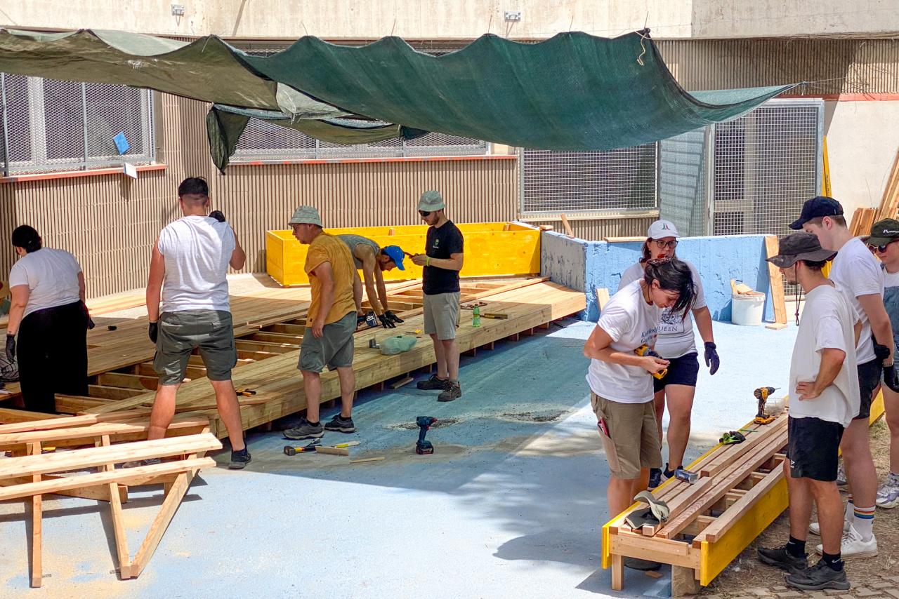A collective self-building process without the need for prior training. Everybody has been enabled to learn how to deal with professional tools, construction techniques, and materials. After the first days of practice, all the participants were almost autonomous.