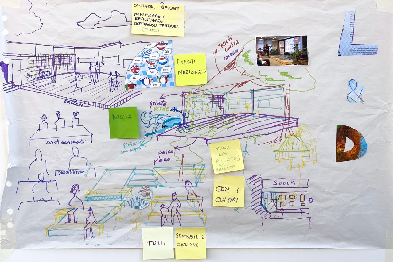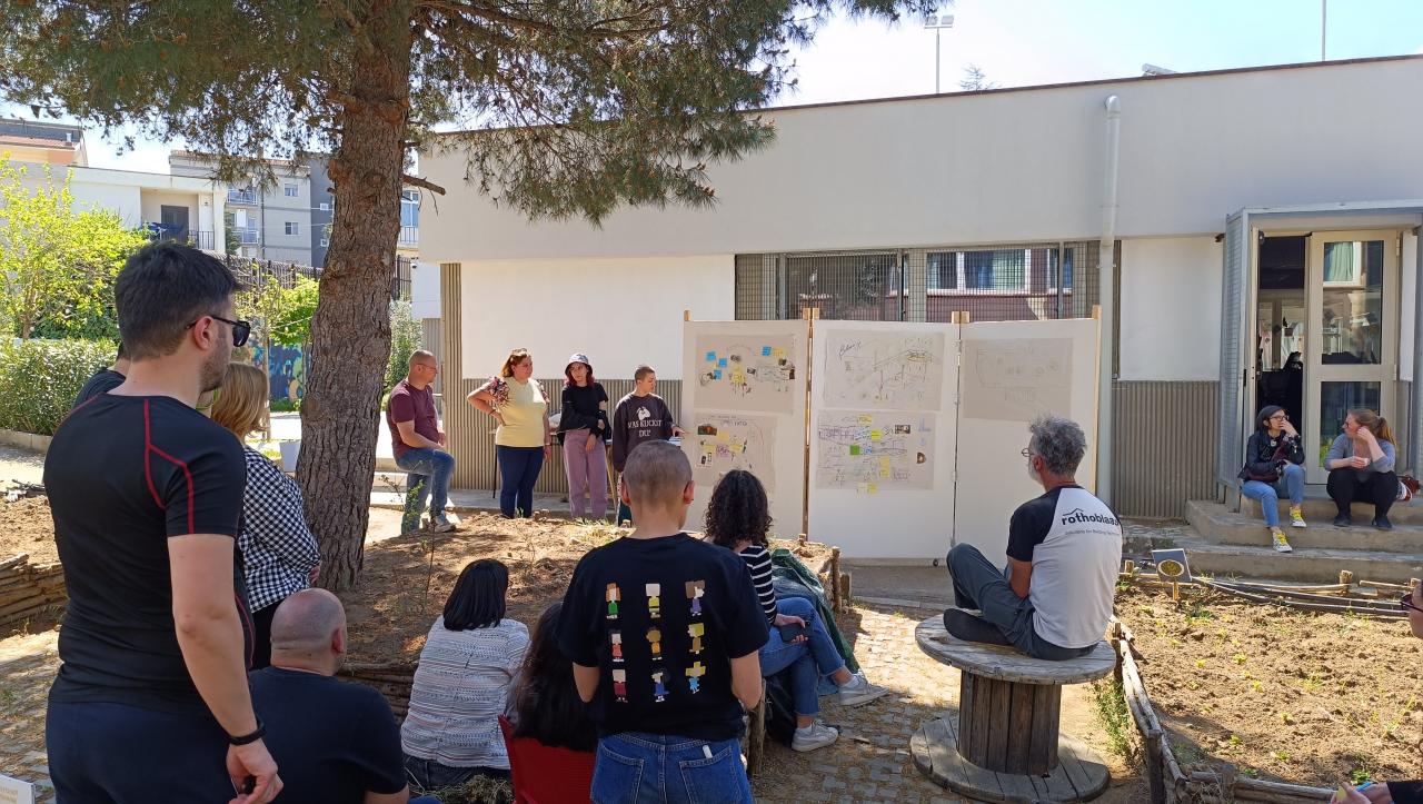 The first step was dedicated to brainstorming, site exploration, and visioning. Through design and thinking exercises participants collected keywords, identifying issues and goals. They placed themselves in the courtyard and the garden and through their body's feedback they highlighted and revealed outdoor critical points and potentialities.