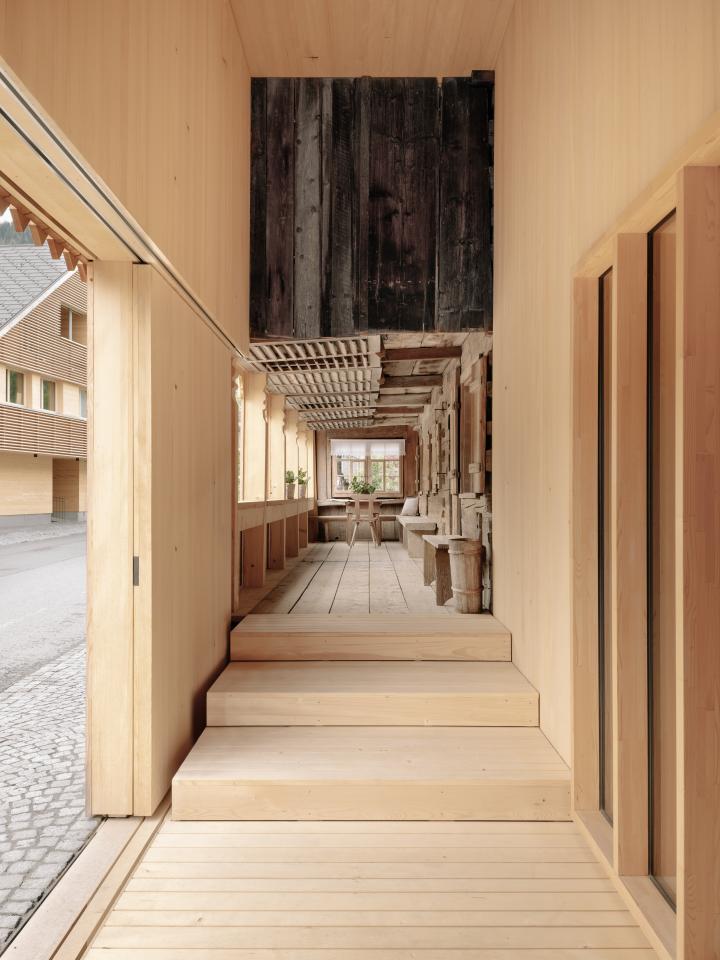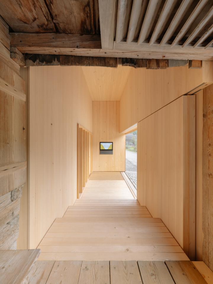 The Museum Bezau is located in the Bregenzerwald region of Austria, in the village of Bezau. As an extension to an existing built structure, the project intertwines the past with the present. The traditional Bregenzerwälderhaus, a farmhouse typology typically divided into a front (“Vorderhaus”), middle (“Tenne”) and rear (“Hinterhaus”) section – used as living quarters, a functional hallway, and a barn – dates back to the 16th century, though the majority of the structure as it stands today primarily dates back to the 1800s. Since 1920, it has served as a museum, highlighting the history of craftsmanship and pioneering roles of women in the region. At some point, the rear section of the building was lost. Since then, the structure has remained incomplete according to its original typology, though it has continued to serve as a museum. With the new extension, the building’s typology has been restored, with the former barn now providing additional space for contemporary museum functions, topics and improved accessibility.