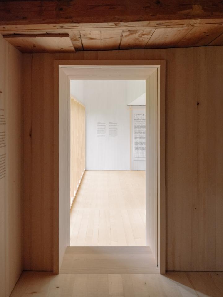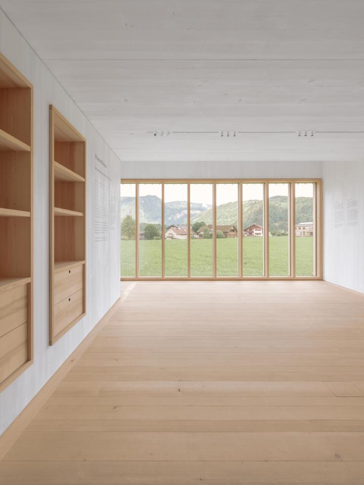 Wood, a traditional building material in the Bregenzerwald, plays a central role not only in construction but also in shaping the overall aesthetic. Local wood craftsmanship, renowned across Austria and internationally, is showcased throughout the project. The interior is crafted entirely from locally sourced wood, with the walls whitewashed to create a textured feel as well as a bright atmosphere that serves as an ideal backdrop for exhibitions. The furniture, created by local carpenters, enhances the space, creating a functional, visual and tactile connection to the region’s artisanal heritage. The careful selection of materials contributes to a comfortable and calming environment, enriching the experience of those who interact with the space and seek connection. Through its educational use, the project offers visitors the opportunity to explore different ways of life and discover the inspiring diversity of craftsmanship.