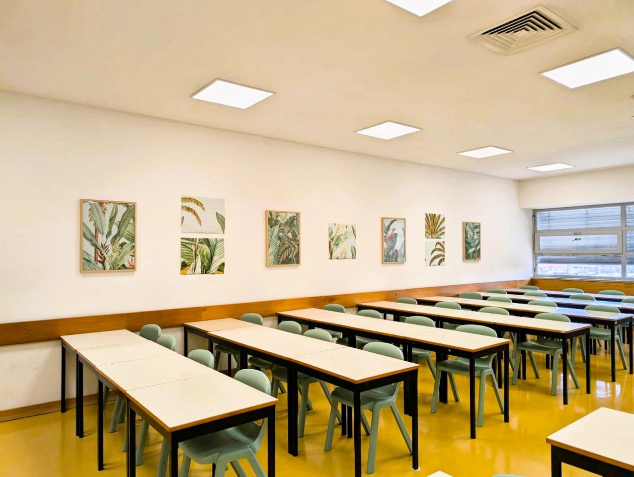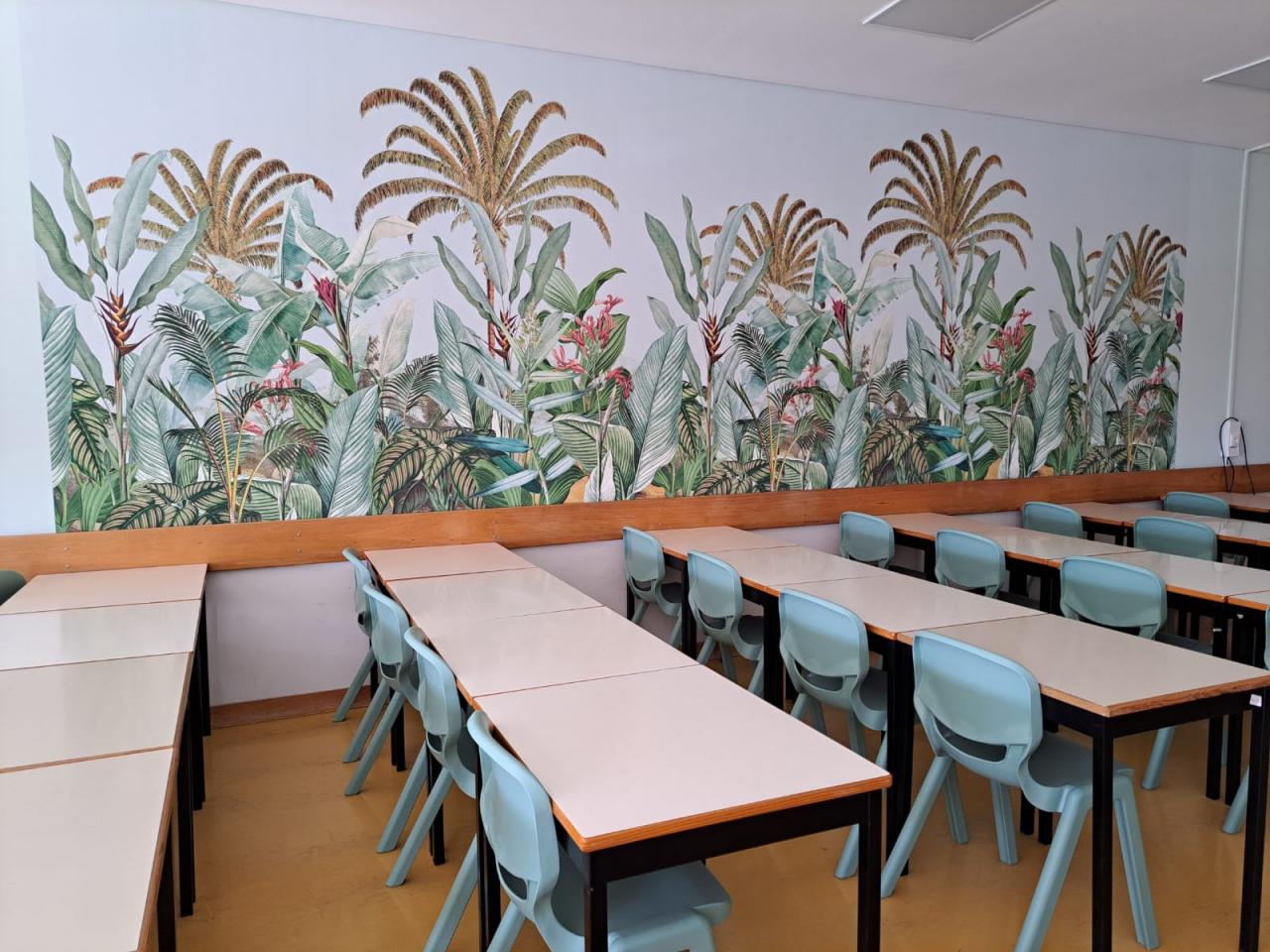 In another classroom, a large mural of a vibrant plant-filled landscape was installed on one wall, and plant images were placed on the opposite wall. The aim was to immerse students in nature through visual stimuli, enhancing the aesthetic quality of the space. These actions were monitored for their impact on stress reduction and cognitive function.