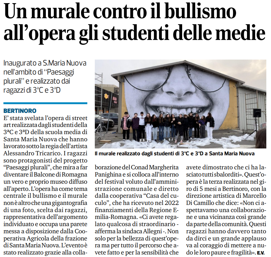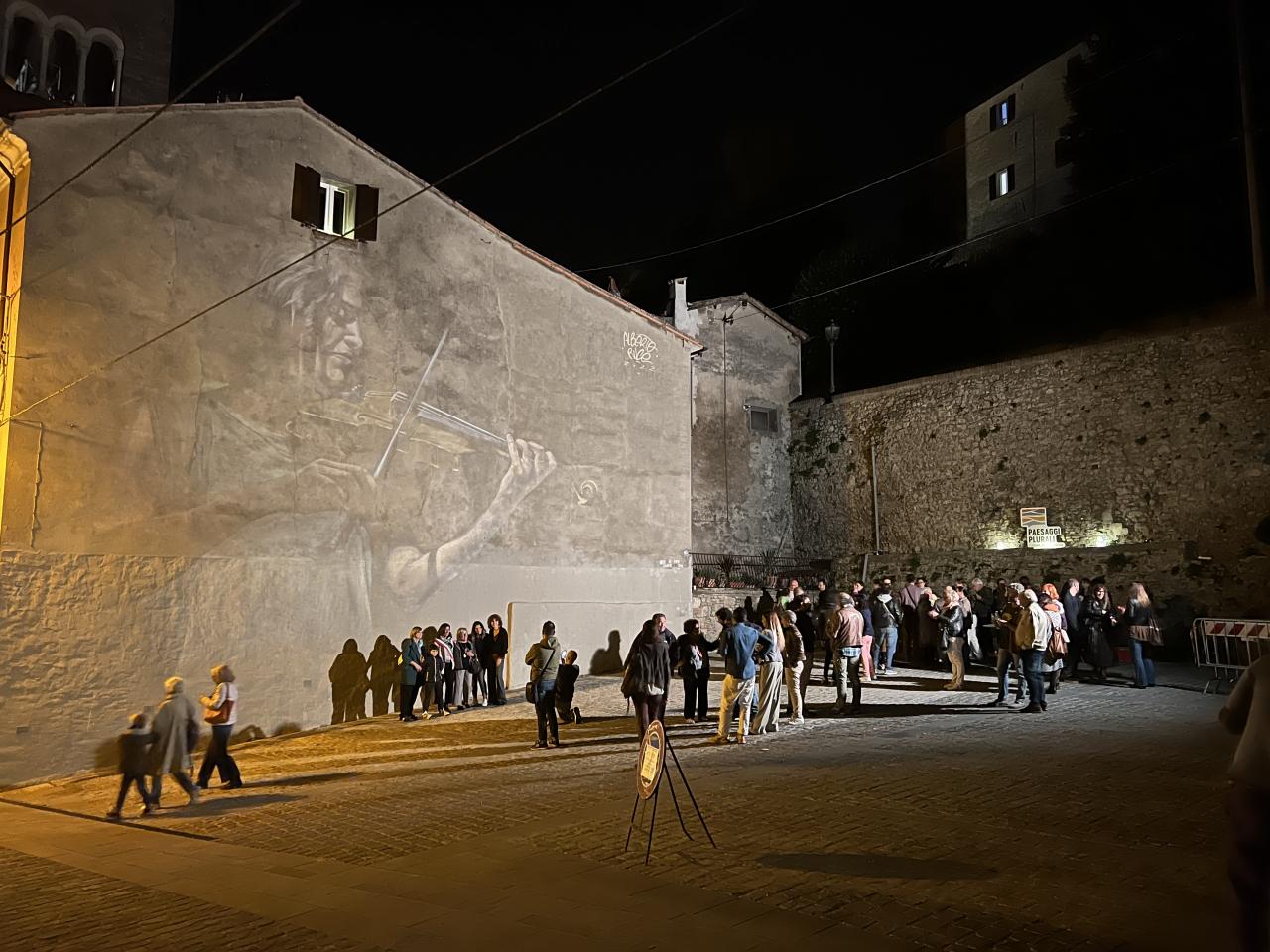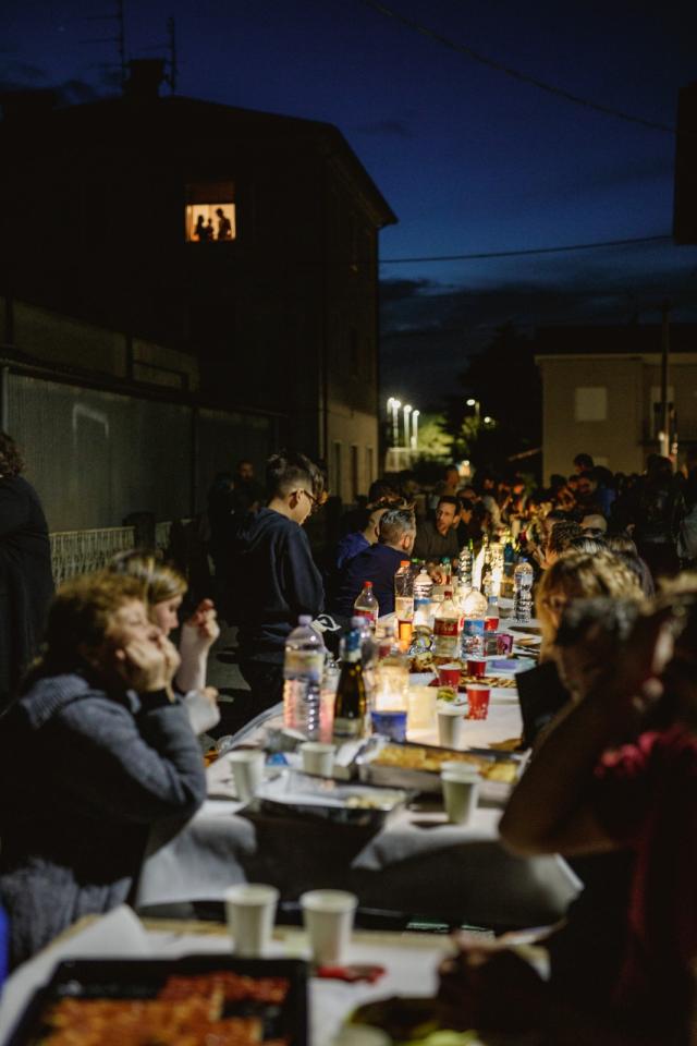 Community engagement and participation is a core component of the festival, and is an ongoing process that continues year after year to encourage public participation in making Bertinoro and its surroundings a better place. Some examples from 2023 are being provided to present the engagement of communities in Paesaggi Plurali. 1.Arnaldo Pambianco was a popular cyclist from Bertinoro who left fond memories in the minds of residents. Artist Luis Gomez de Teran was captivated by the affection residents felt for the sportsman, and lived in a Bertinoro home to work with community members to co-design a mural honoring Pambianco; residents were involved in the choice of material, location as well as design of the artwork. They also took care of sewing a big cloth which covered the mural before its inauguration, and then took part in a public performance in the adjacent square which saw a wool thread being passed on from person to person to symbolise synergy, connection and relation to Pambianco, Gomez, as well as the presence of the community in the town life. 2. Artist Mohamed Galcham was hosted by small village Santa Maria Nuova residents to work with the local youths to a welcome dinner held in the public square of the locality, where the community gathered for an evening of relaxation and sharing. Inspired by the energy of the locals, Galcham led a performance (joined by the attendees) and co-designed a mural with them representing the act of sharing space, a meal and own stories, which overlooks the place where the dinner took place. The festival let the youths decide on the event activities, promotion, logistics, which created empowerment and ownership. The organisers presented the techniques of public art and placemaking to the youths as part of the educational activities linked to this project, which the youths could then practice with temporary photographic and wall installations in the locality before and during the dinner.