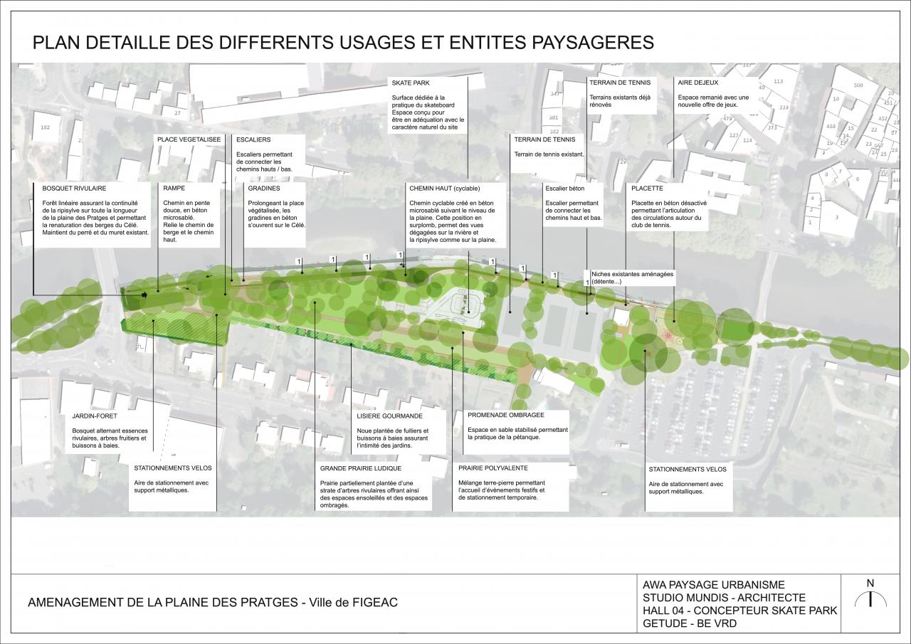 The aim is to be able to respond and work collectively in the fields of landscaping, botany and heritage, with the site classified as an environmental site and partially included in the Remarkable Heritage Site of the town of Figeac, but also in the sporting field with specific features linked to sports facilities and meeting the requirements for homologation for competitions (Skatepark).