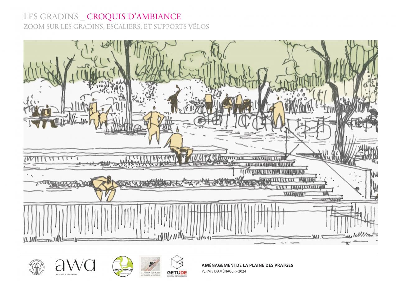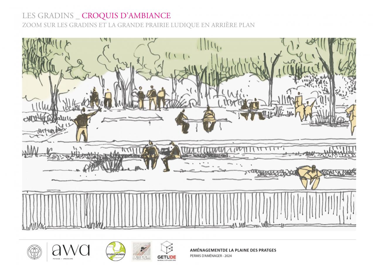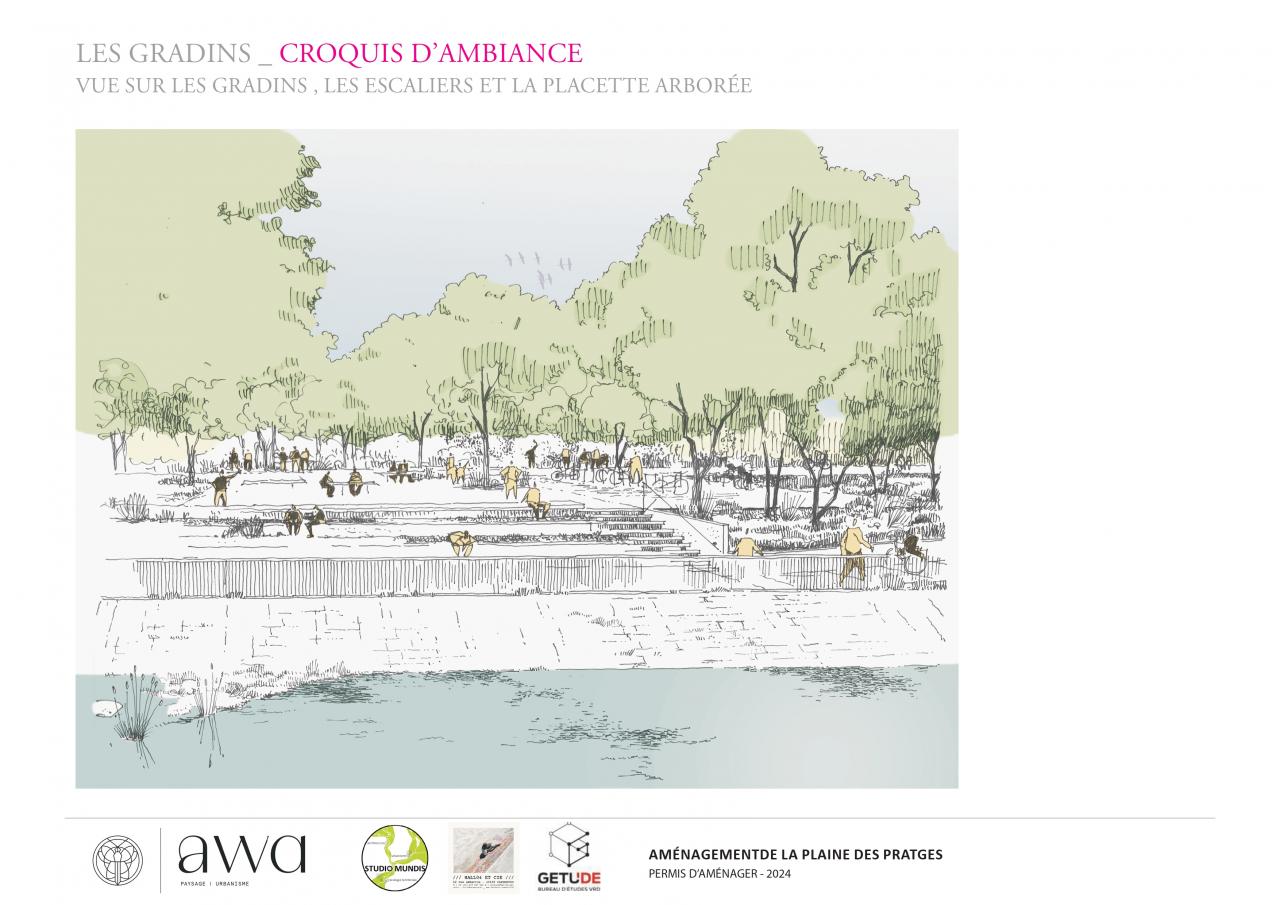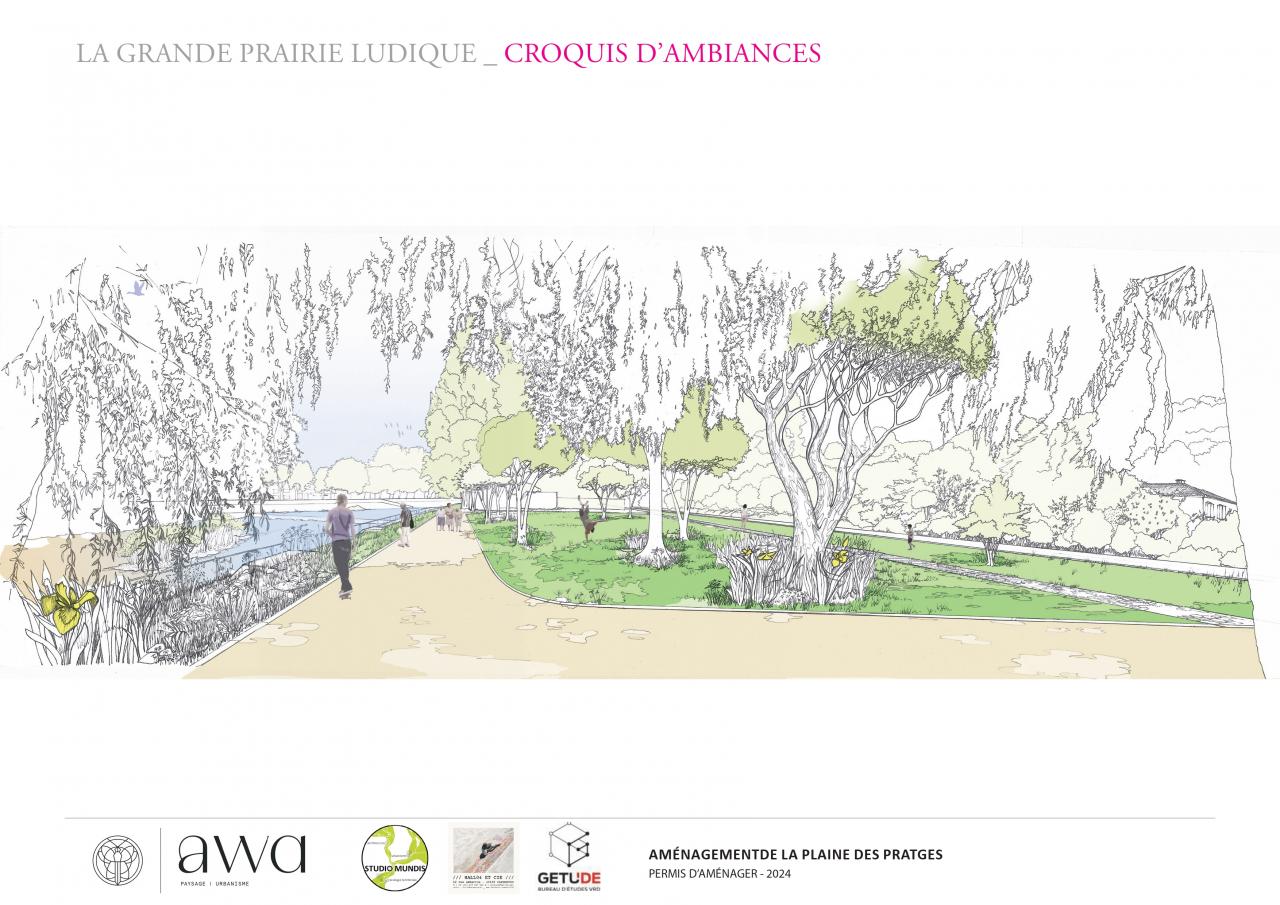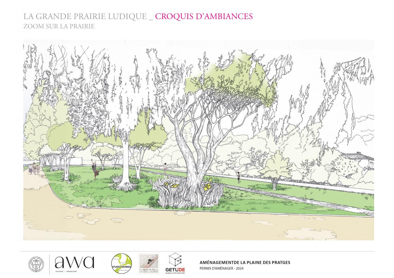 - Following on from the existing tree network, the clusters and rows of trees, made up of large stemmed or vined trees acclimatised to the region, will reveal a more spectacular dimension borrowed from the imagination of English-style parks. The trees will enliven the landscape with their colours and textures of foliage throughout the seasons. These trees, adapted to the urban environment, will give the Pratges a park-like character.